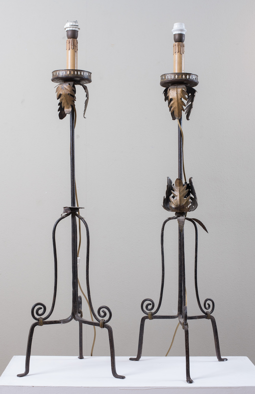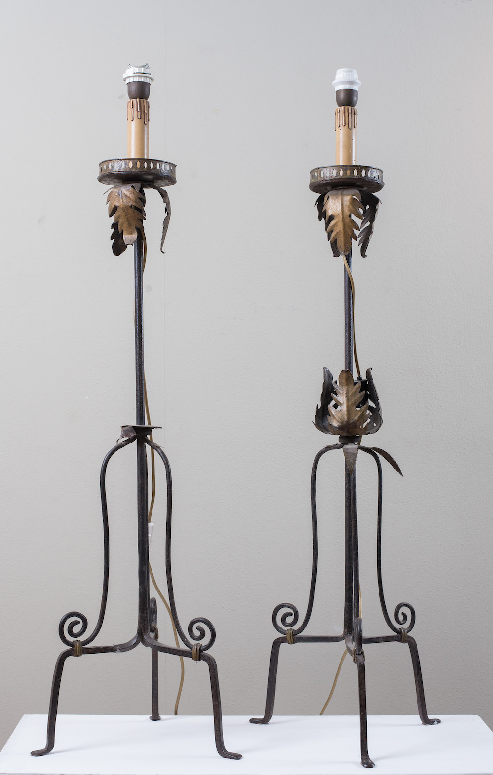 Coppia di candelabri in ferro forgiato e sbalzato. XVII secolo. Cm 124x24x24