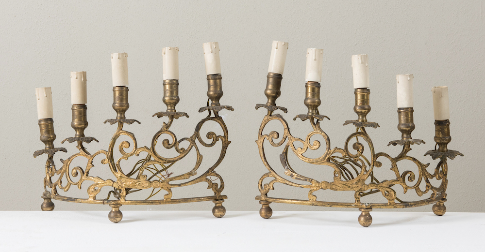 Coppia di candelabri in bronzo dorato. Fine XIX secolo. Cadauno di cm 29,5x32x10.