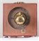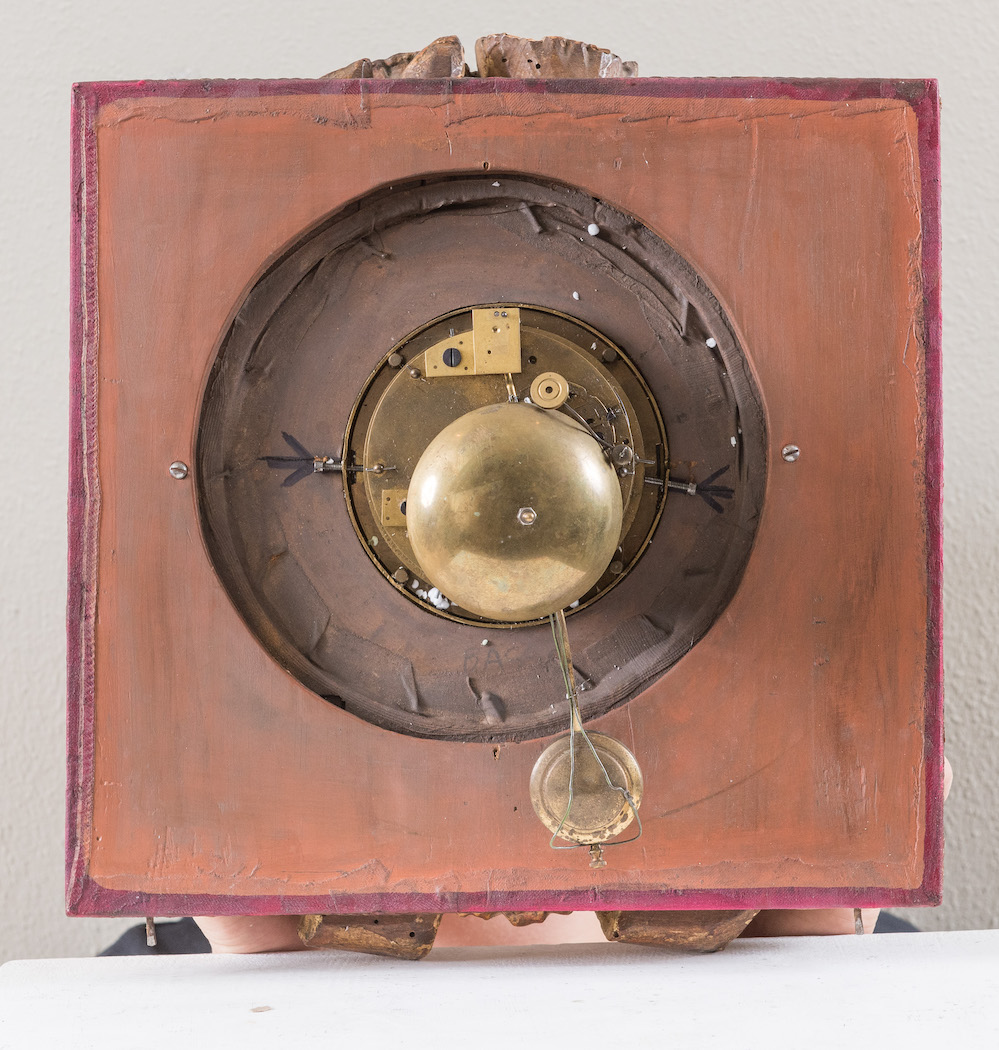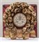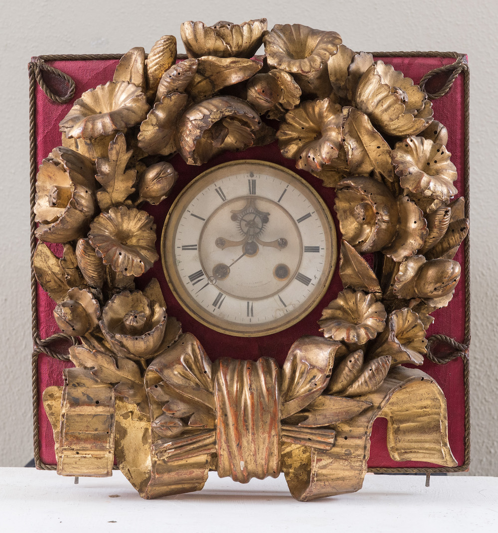 Orologio inserito in ghirlanda in legno intagliato e dorato. Cm 35x32x10.