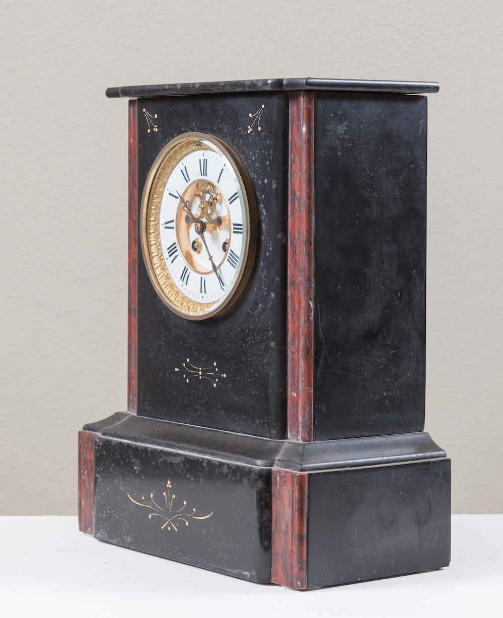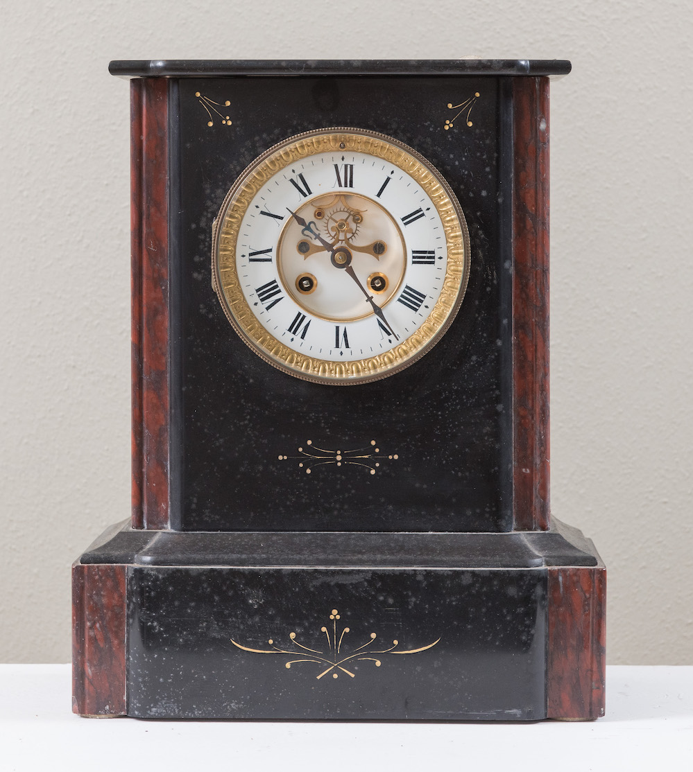 Orologio in marmo nero del Belgio e profilatura in marmo rosso. XIX secolo....