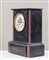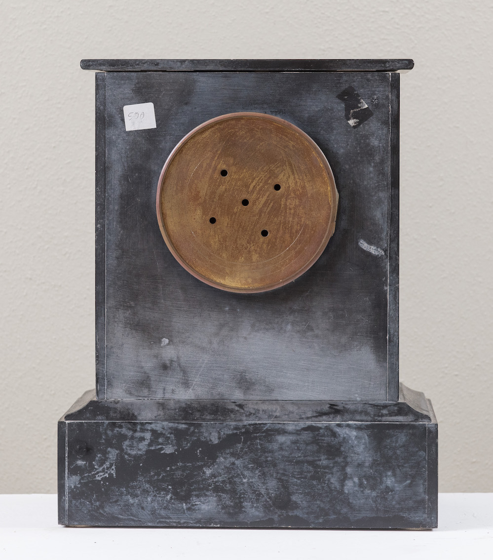 Orologio in marmo nero del Belgio e profilatura in marmo rosso. XIX secolo. Cm 34x28x14,5 (Difetti)