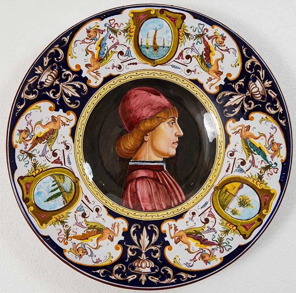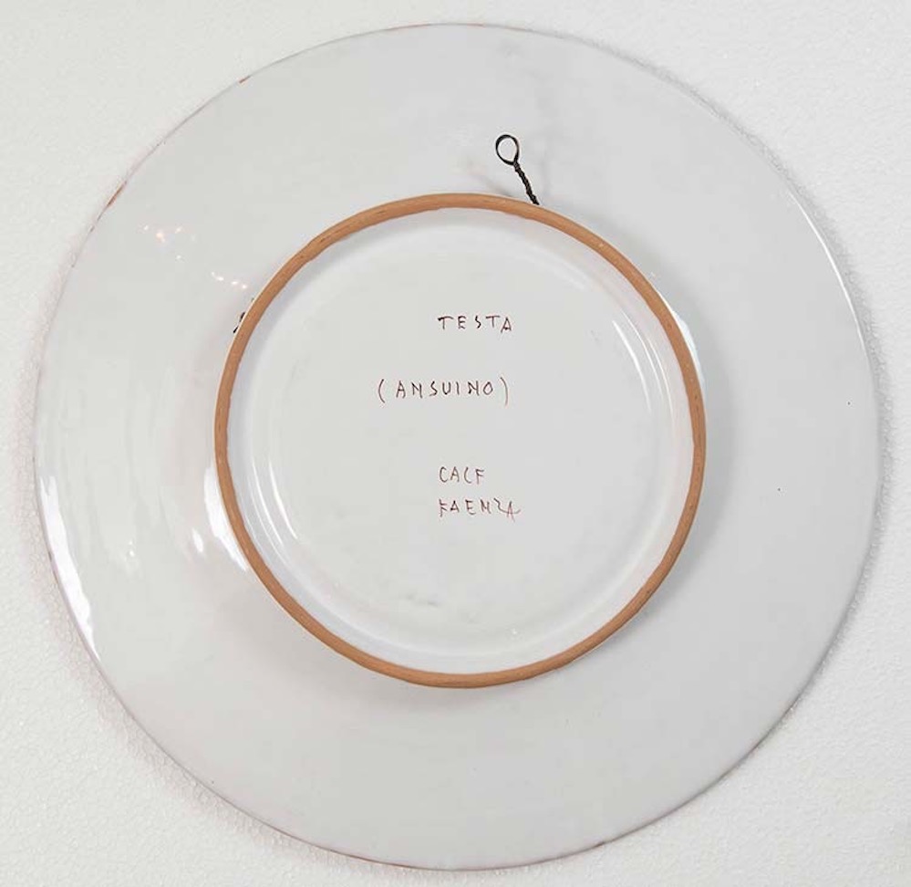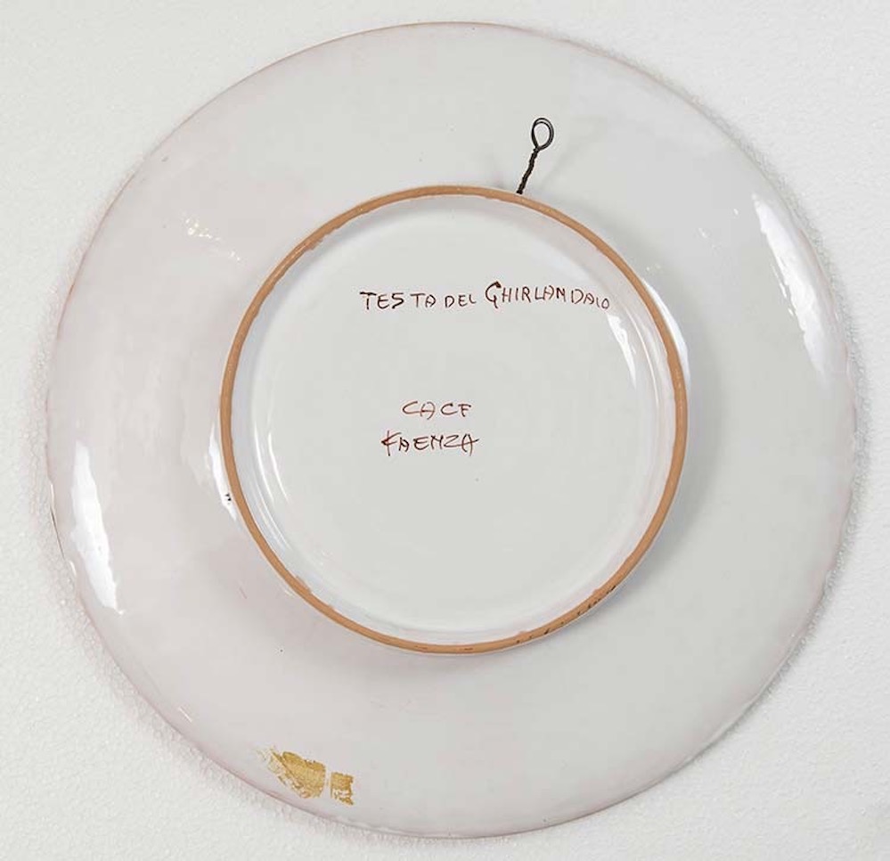 MANIFATTURA CACF, Faenza, metà del XX secolo. Coppia di piatti in ceramica, raffiguranti una testa femminile dal Ghirlandaio e una testa maschile da Ansuino da Forlì. Sotto le basi recano scritte CACF - Faenza e Testa del Ghirlandaio, Testa (Ansuino). Ciascuno di Ø cm 43.