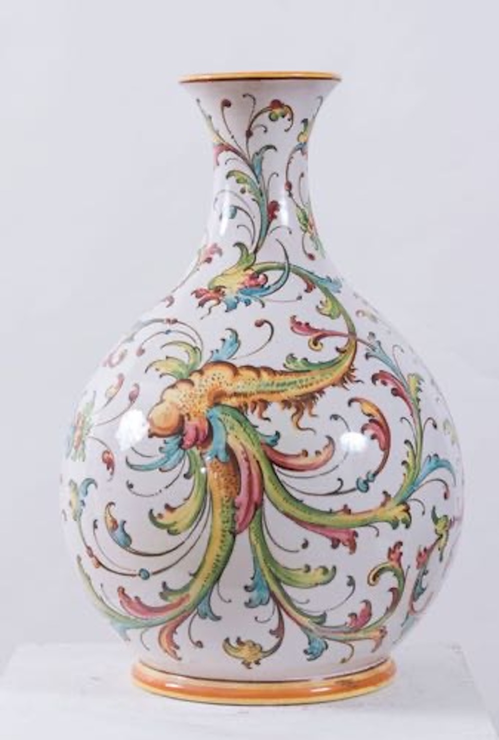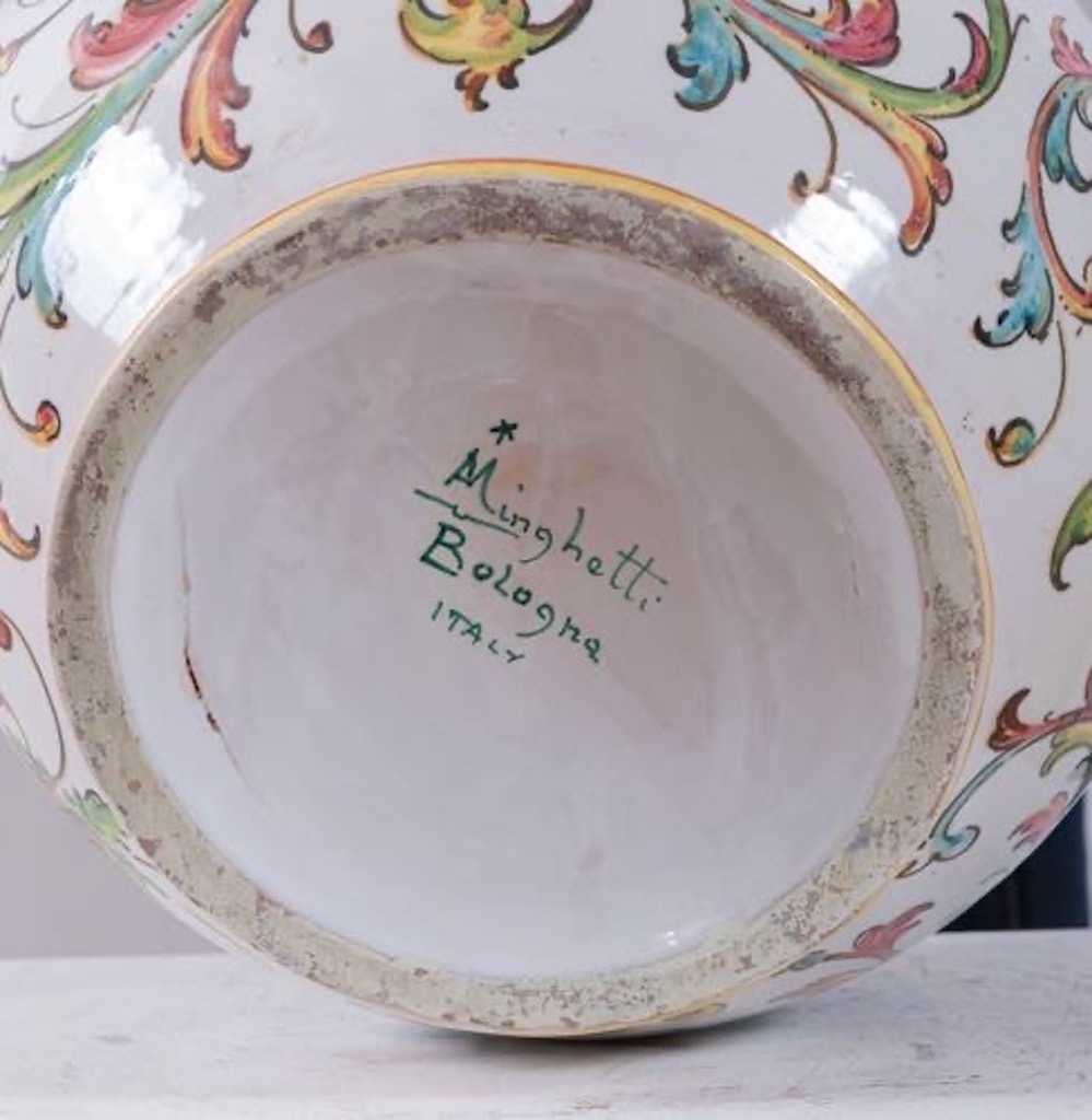 ANGELO MINGHETTI, Bologna, XX secolo. Vaso in ceramica policroma. H. cm 40; diametro cm 25. Sotto la base reca scritta Minghetti Bologna Italia. (difetti)