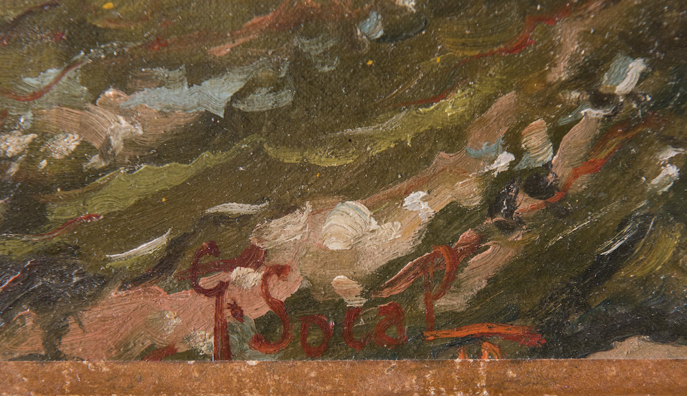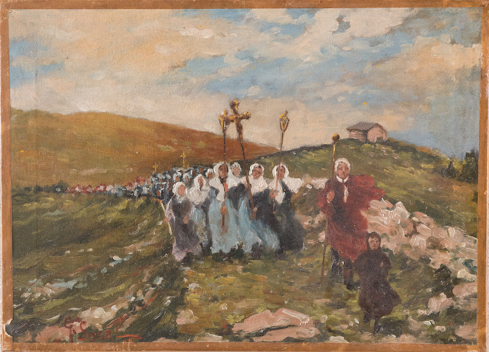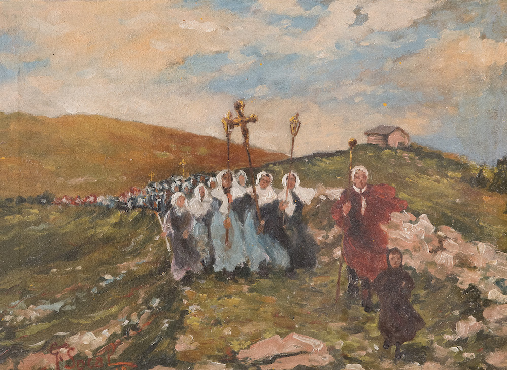 Pittore anonimo “Processione” Olio su tela. Cm 29,5x40. Reca firma indecifrata in basso a sinistra.