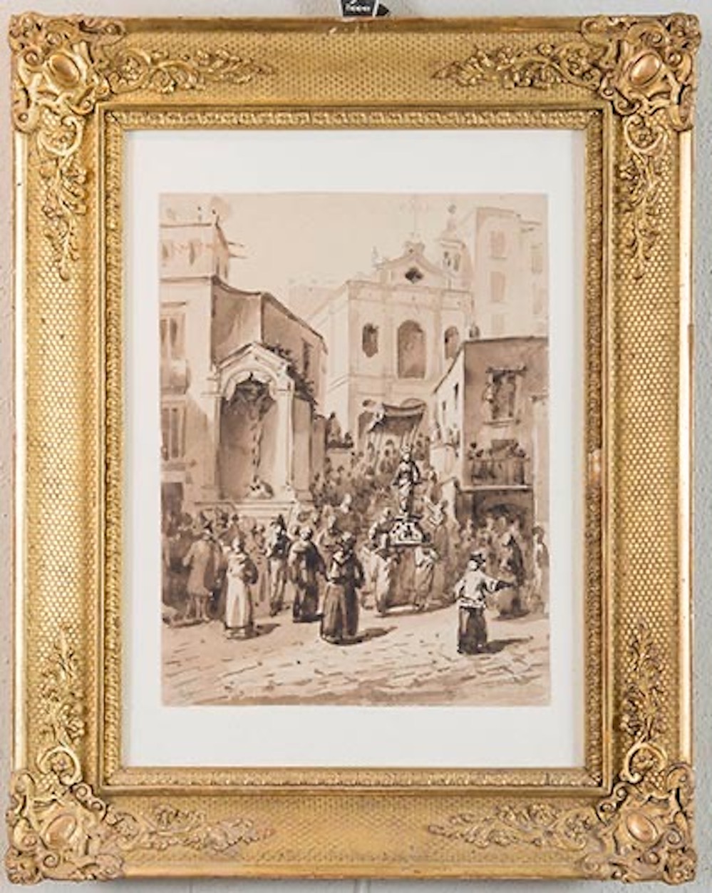 Pittore anonimo del XIX secolo “Processione”. Acquerello su carta. Cm 29,5x22,5.
