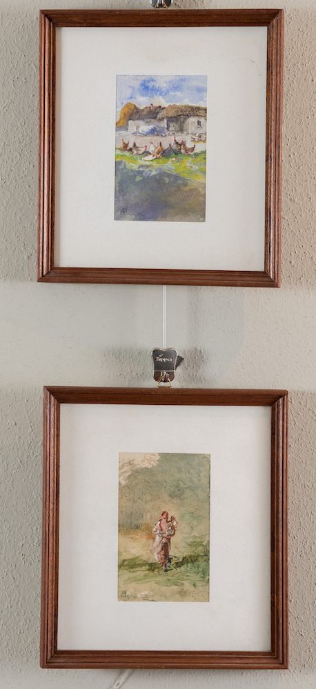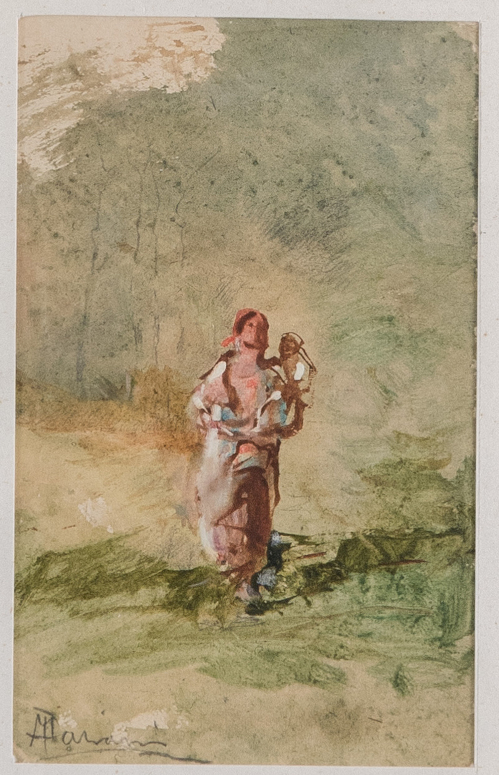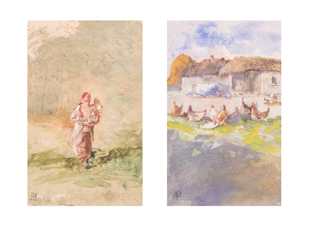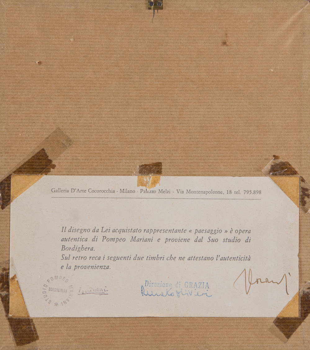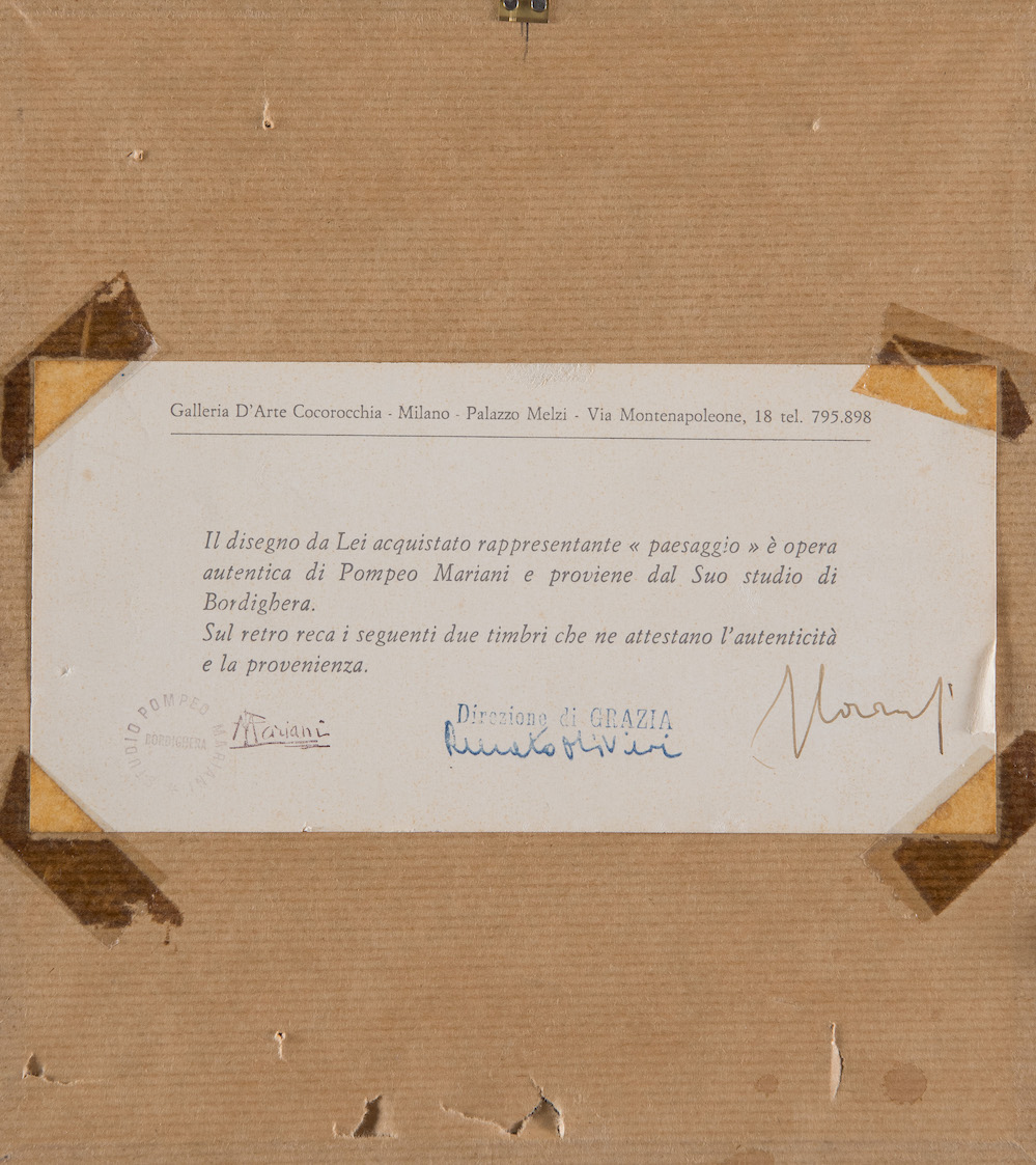 POMPEO MARIANI (Monza 1857 – Bordighera 1927) Coppia di tecniche miste su carta. Il primo reca sigla AM ed è di cm 12,5x8. Il secondo reca firma PMariani ed è di cm 12,5x8,2. Al retro recano autentica della Galleria d'Arte Cocorocchia con timbri dello Studio Pompeo Mariani.