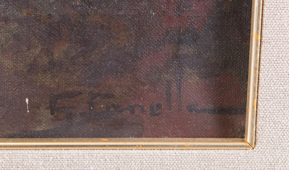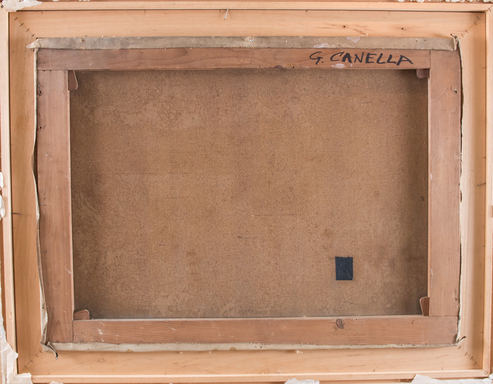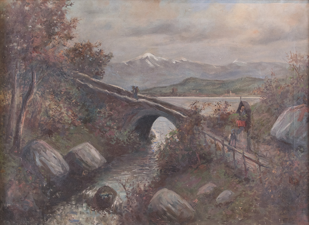 G. CANELLA "Paesaggio lacustre con ponte". Olio su tela. Cm 68,5x93. Opera firmata in basso a destra G. Canella.