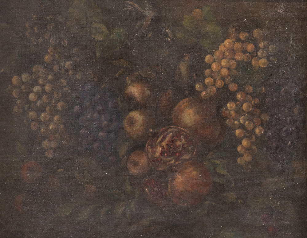 Pittore anonimo del XX secolo. "Natura morta con melagrana e uva". Olio su tela. Cm 54x67,5.