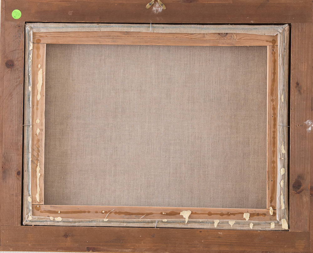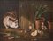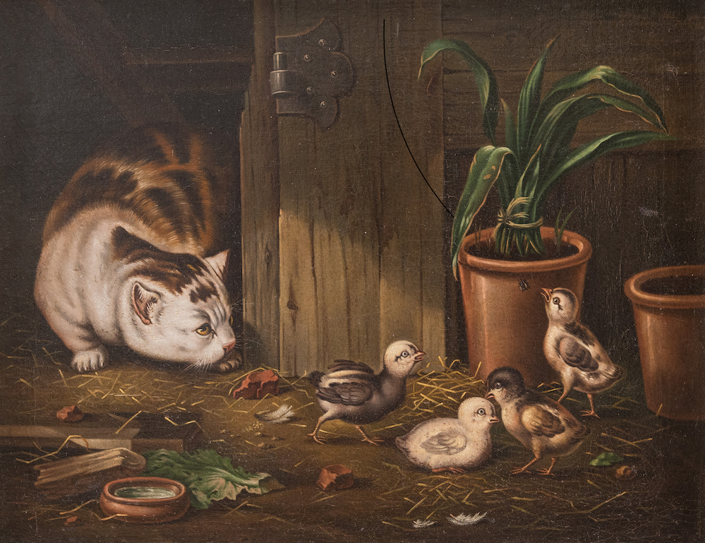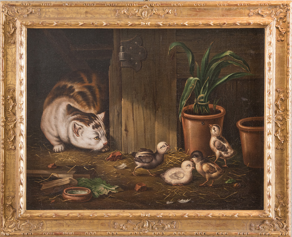 Maestro del XIX secolo. “Scena di cortile con gatto e pulcini”. Olio su tela. Cm 47x61.