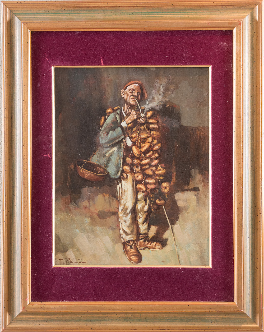 TITO PELLICCIOTTI (1872-1943/50) "Il cipollaio". Olio su tela applicato su cartone. Cm 40,5x30,5. Opera firmata in basso a sinistra Tito Pellicciotti.