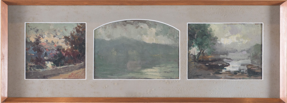 GIUSEPPE SOLENGHI (Milano 1879 - Cernobbio 1944) "Trittico di paesaggi". Olio su faesite. Cm 18x67. Opera firmata in basso a sinistra G. Solenghi.