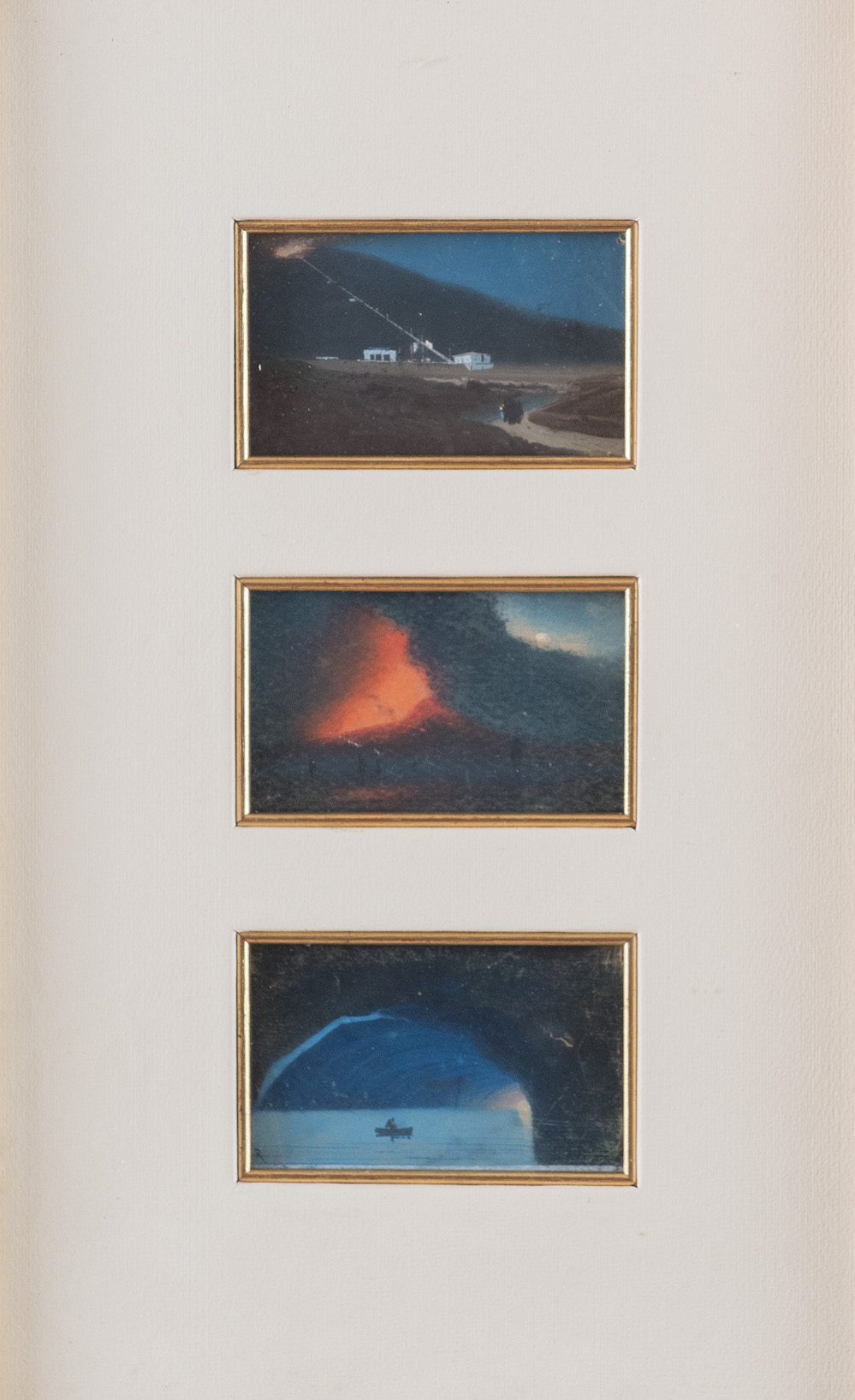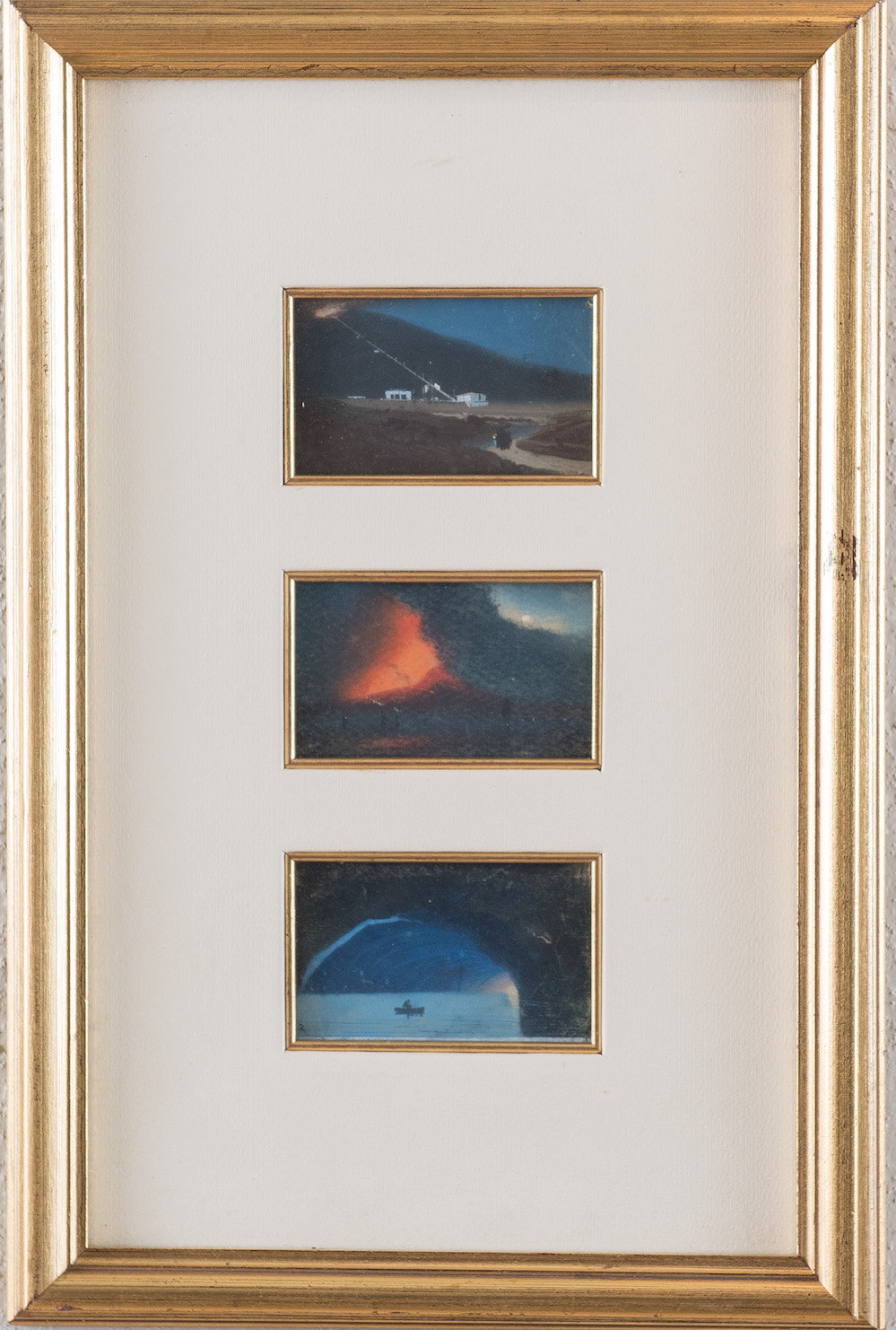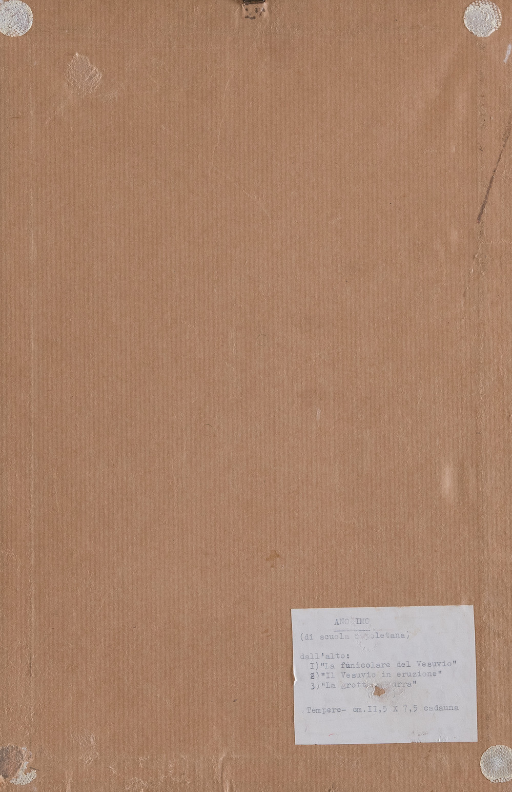 Pittore anonimo di scuola napoletana, XX secolo. Lotto composto da tre tempere su carta. Cadauna di cm 7,5x11,5. Al retro reca etichetta con titoli delle opere, dall'alto: "La funicolare del Vesuvio"; "Il Vesuvio in eruzione"; "La grotta di Vurra".
