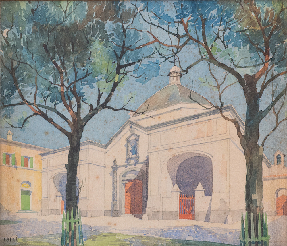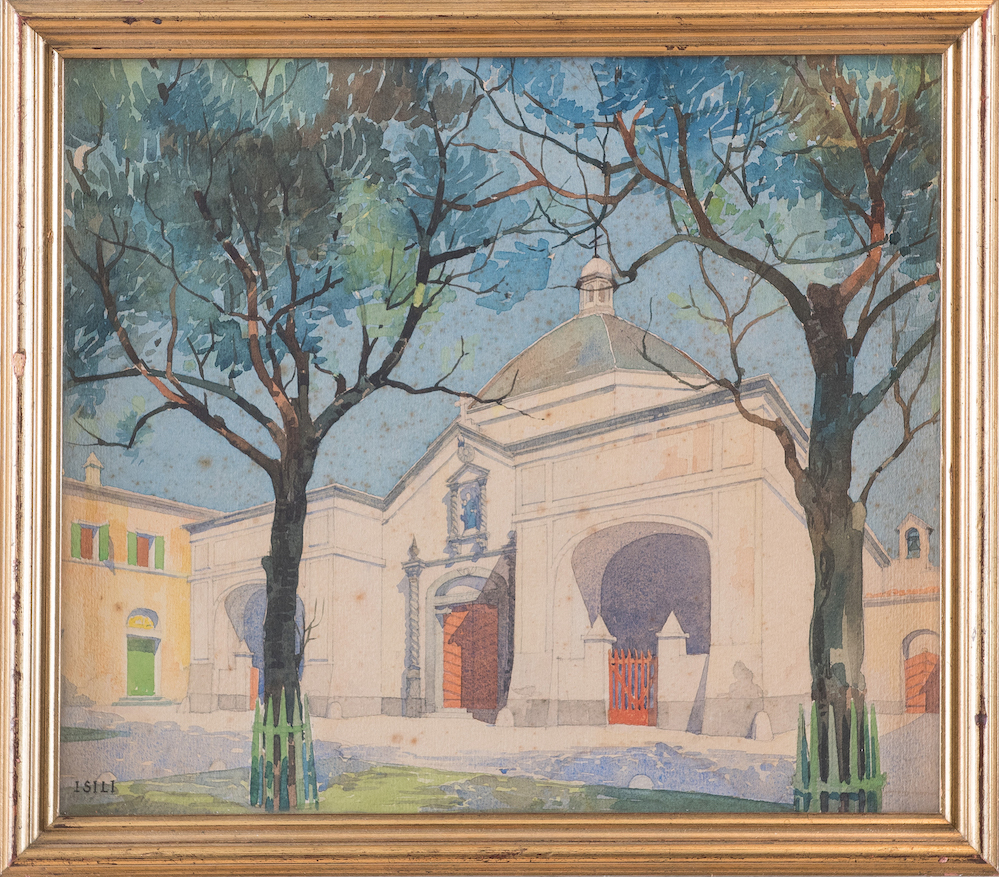 Pittore anonimo del XX secolo “Architettura”. Acquerello su carta. Cm 28x32,5. Opera firmata in basso a sinistra Isili.