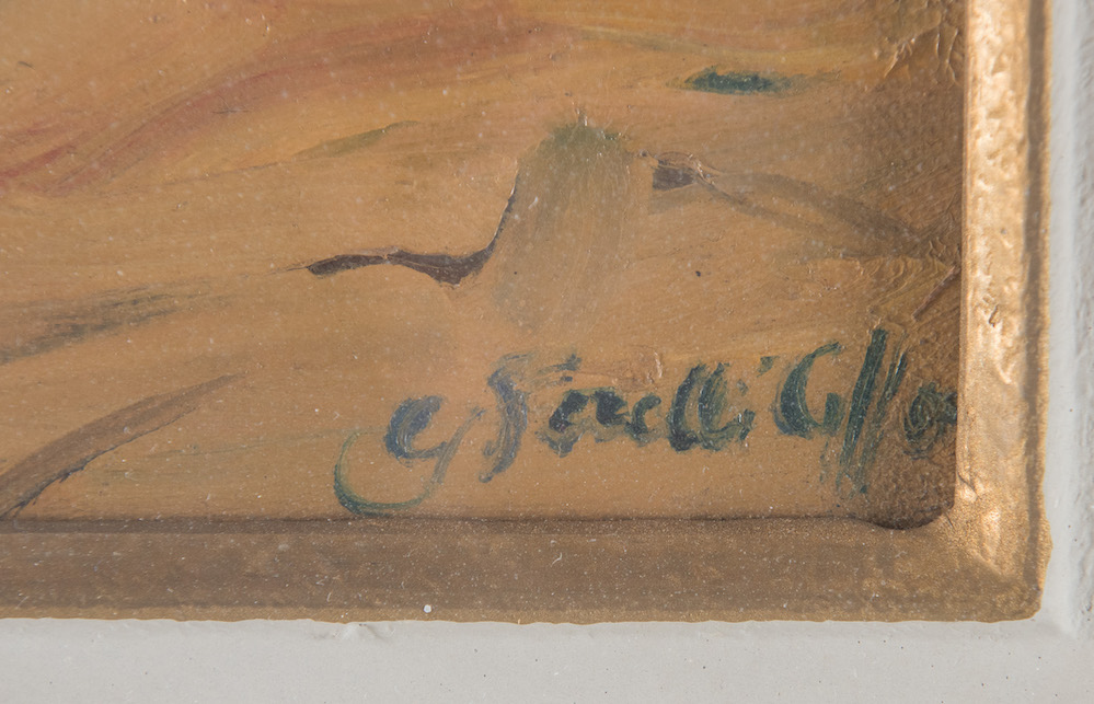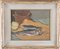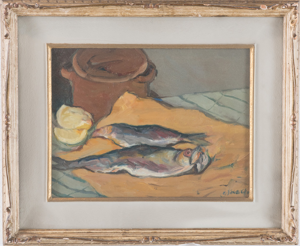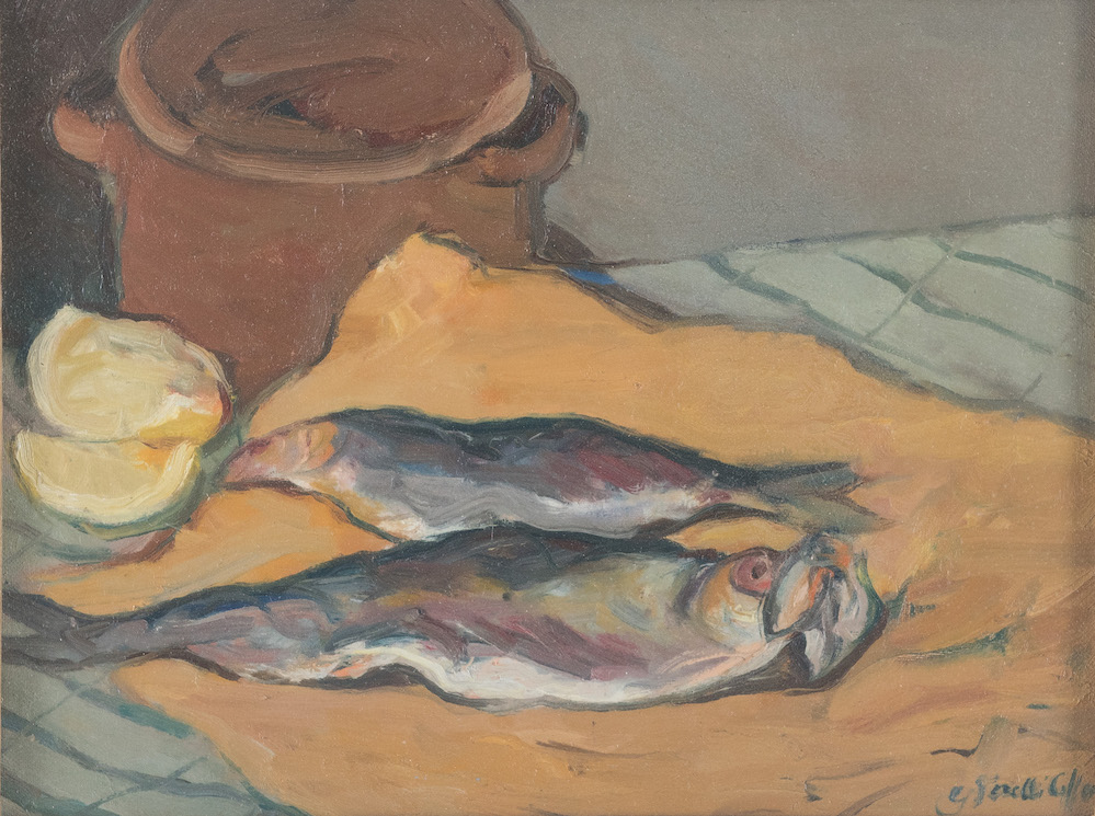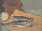 Pittore anonimo del XX secolo "Natura morta con pesci". Olio su tela. Cm 30x40,5. Opera firmata in basso a destra con firma non decifrabile.