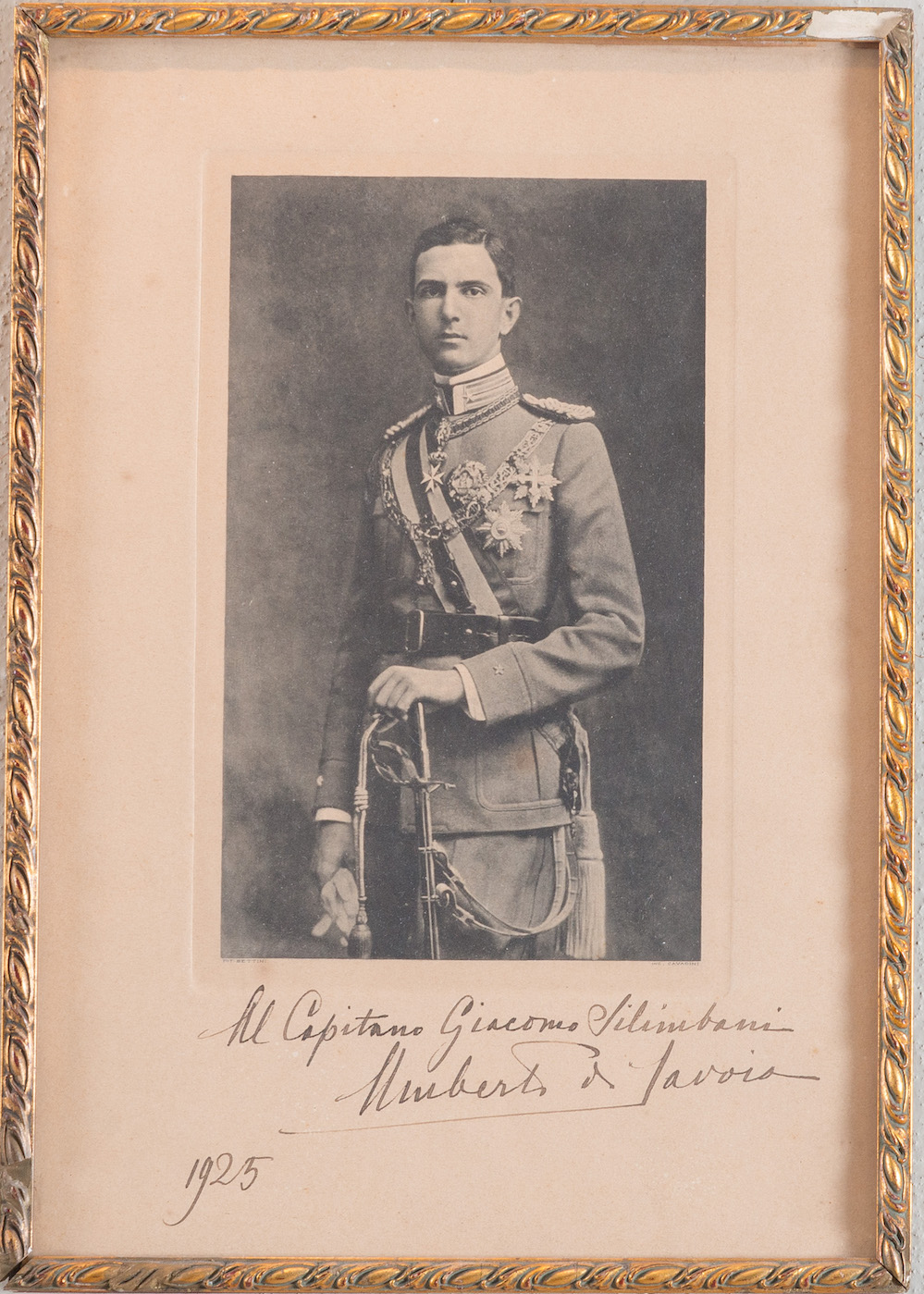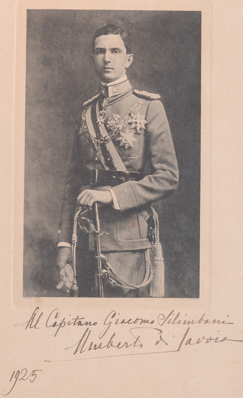 Fotografia in bianco e nero del principe Umberto II di Savoia (1904-1983), con autografo. Cm 35,5x24,5. La fotografia in basso a sinistra reca data 1925. Le misure della stampa sono cm 24,5x15,5.