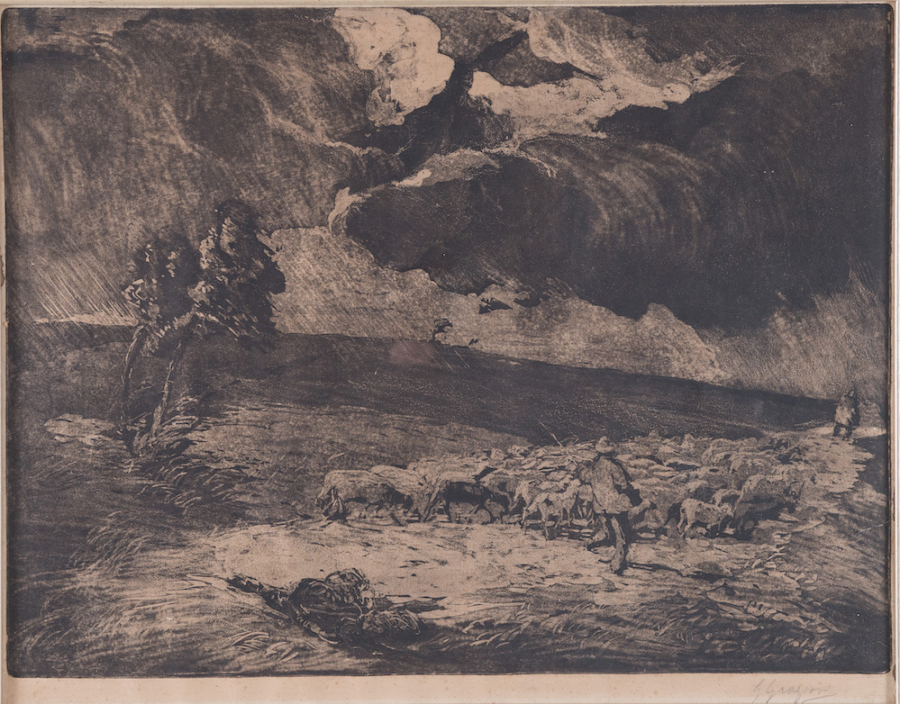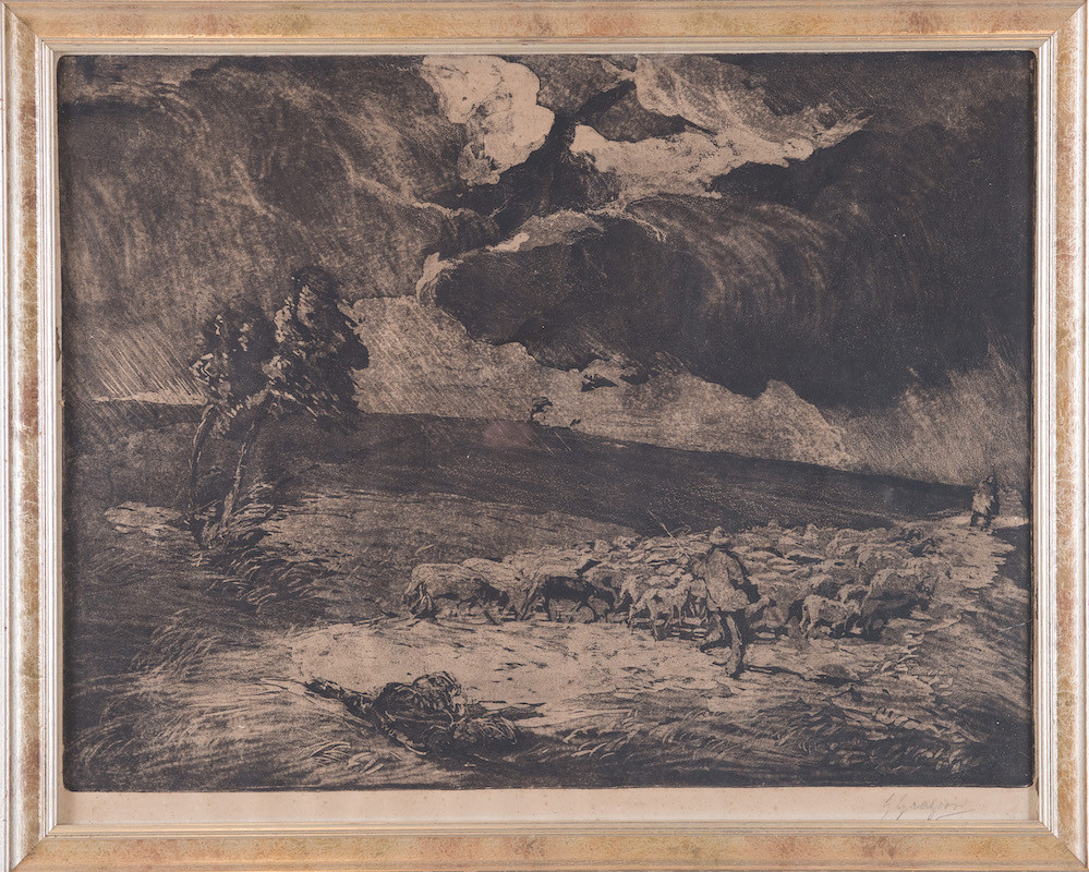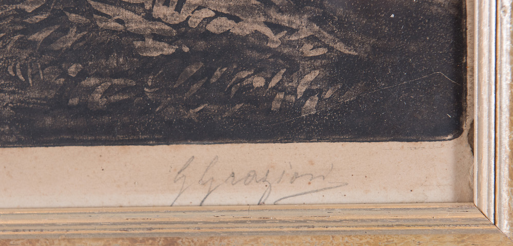 GIUSEPPE GRAZIOSI (1879-1842) "Paesaggio". Litografia su carta. Cm 51x64. Opera firmata in basso a destra G. Graziosi. Al retro reca etichetta della Cartiera subalpina Sertorio, Torino (113)".
