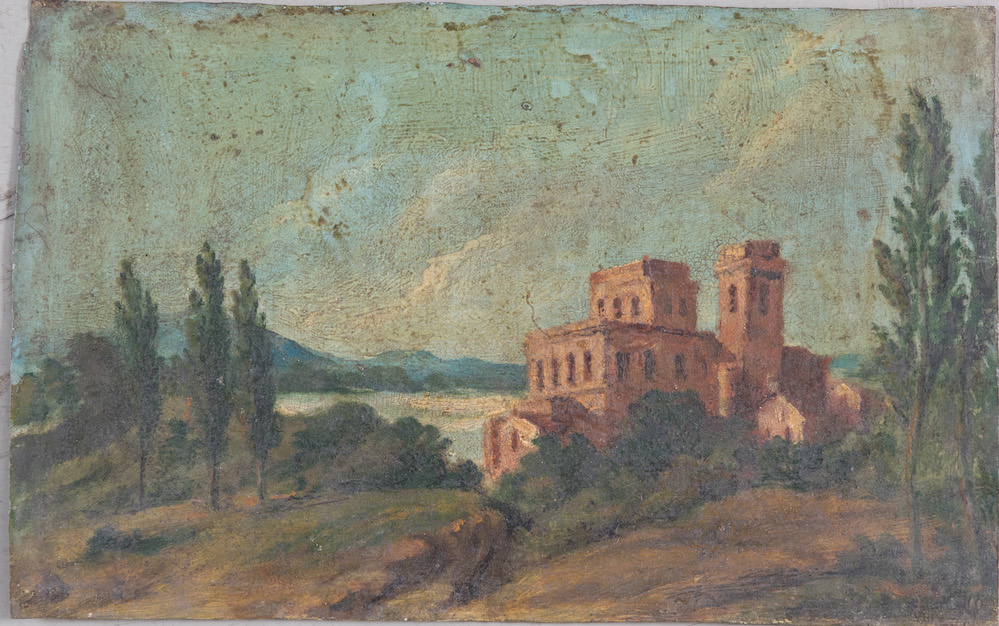 Maestro del XIX secolo. "Paesaggio con castelli". Dipinto su metallo. Cm 21,5x34.