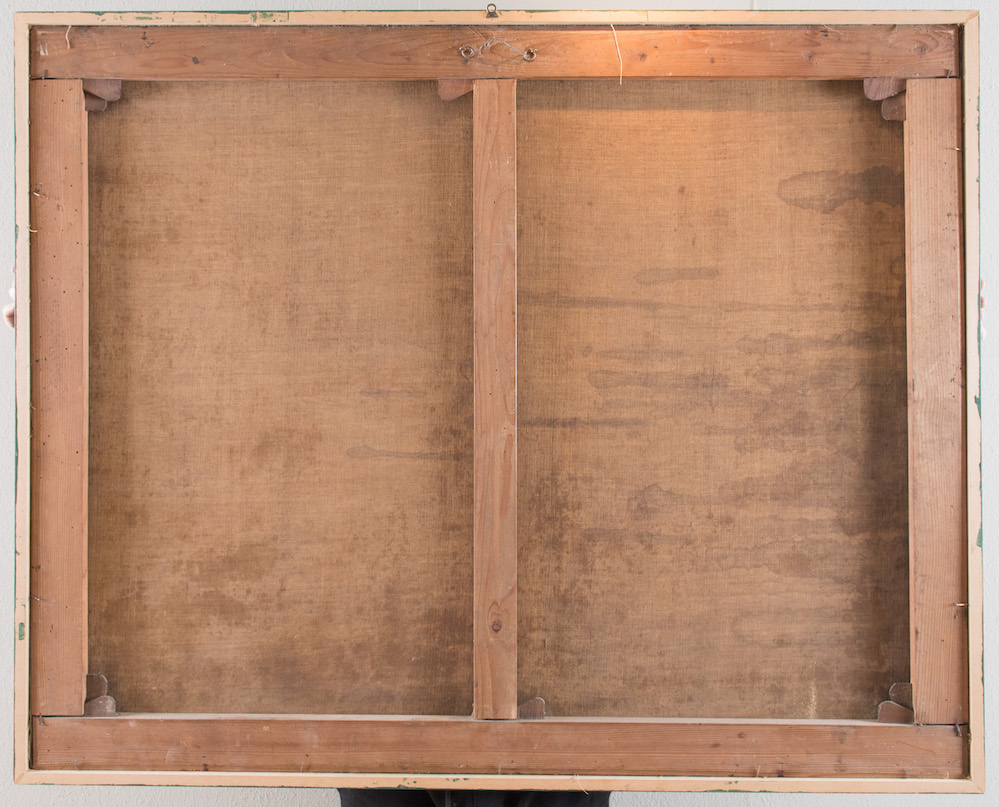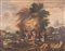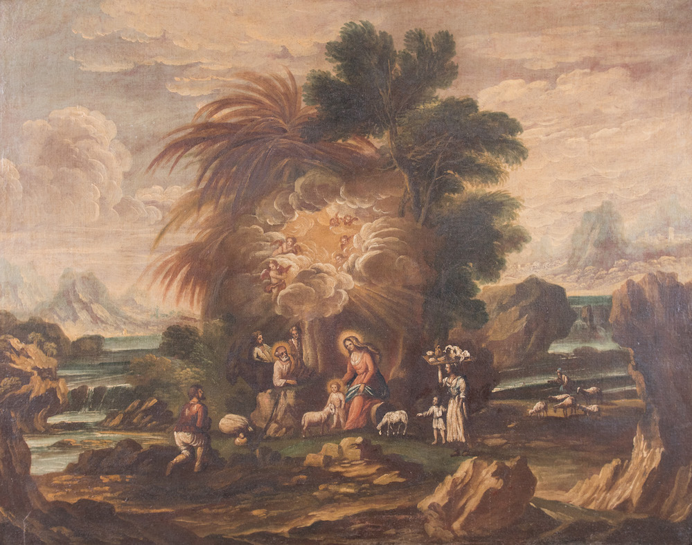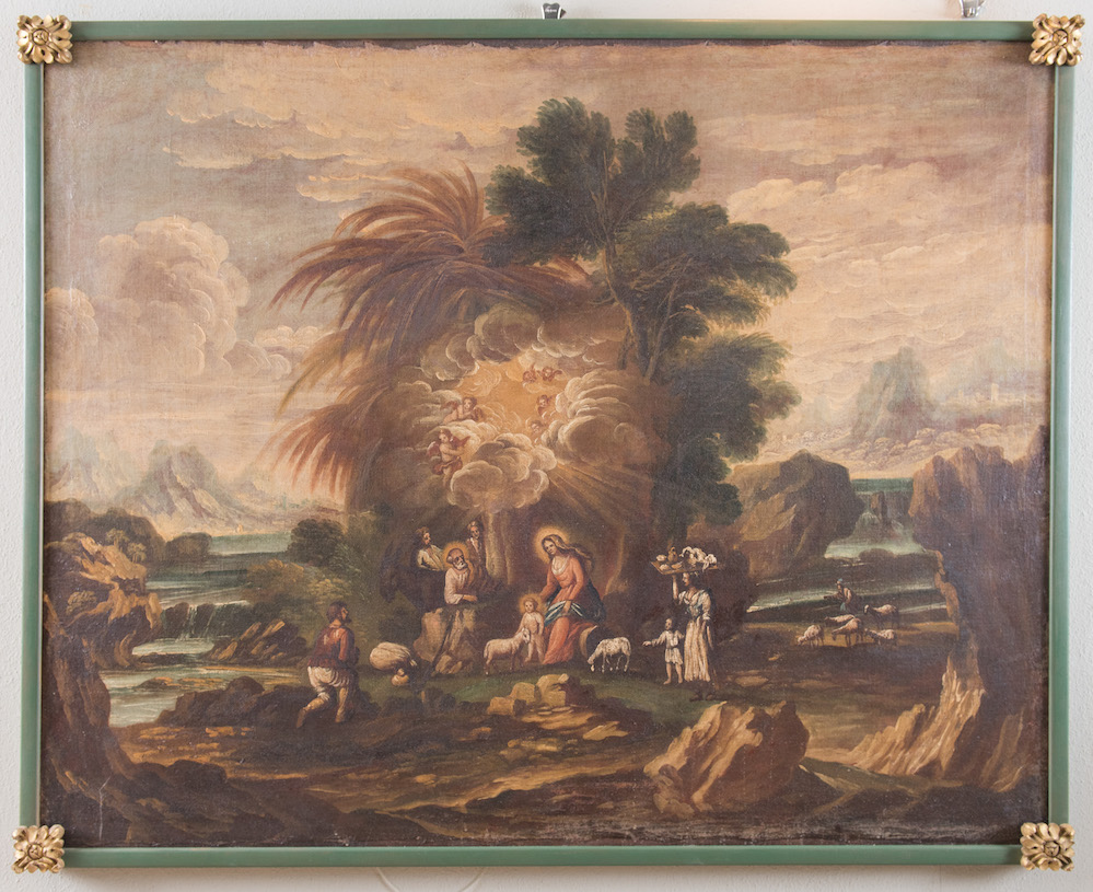 Maestro del XVII secolo. "Paesaggio con natività". Olio su tela. Cm 98x122,5.