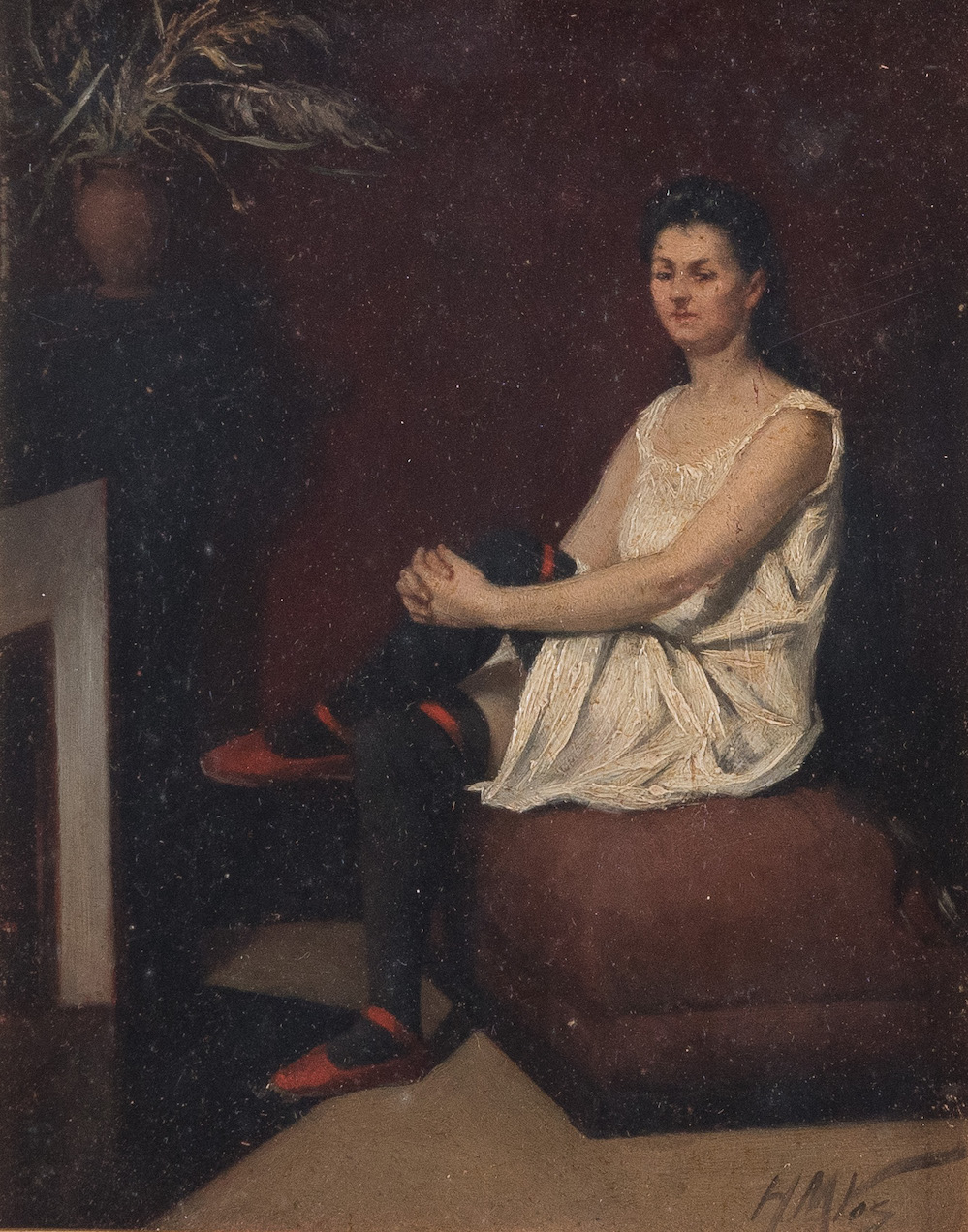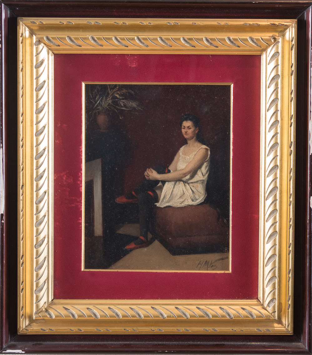 HUBERT M. VOS (1855-1935), attr. "Ritratto di donna seduta". Olio su tavola. Cm 26,5x20,5. Opera firmata in basso a destra H. M. Vos.