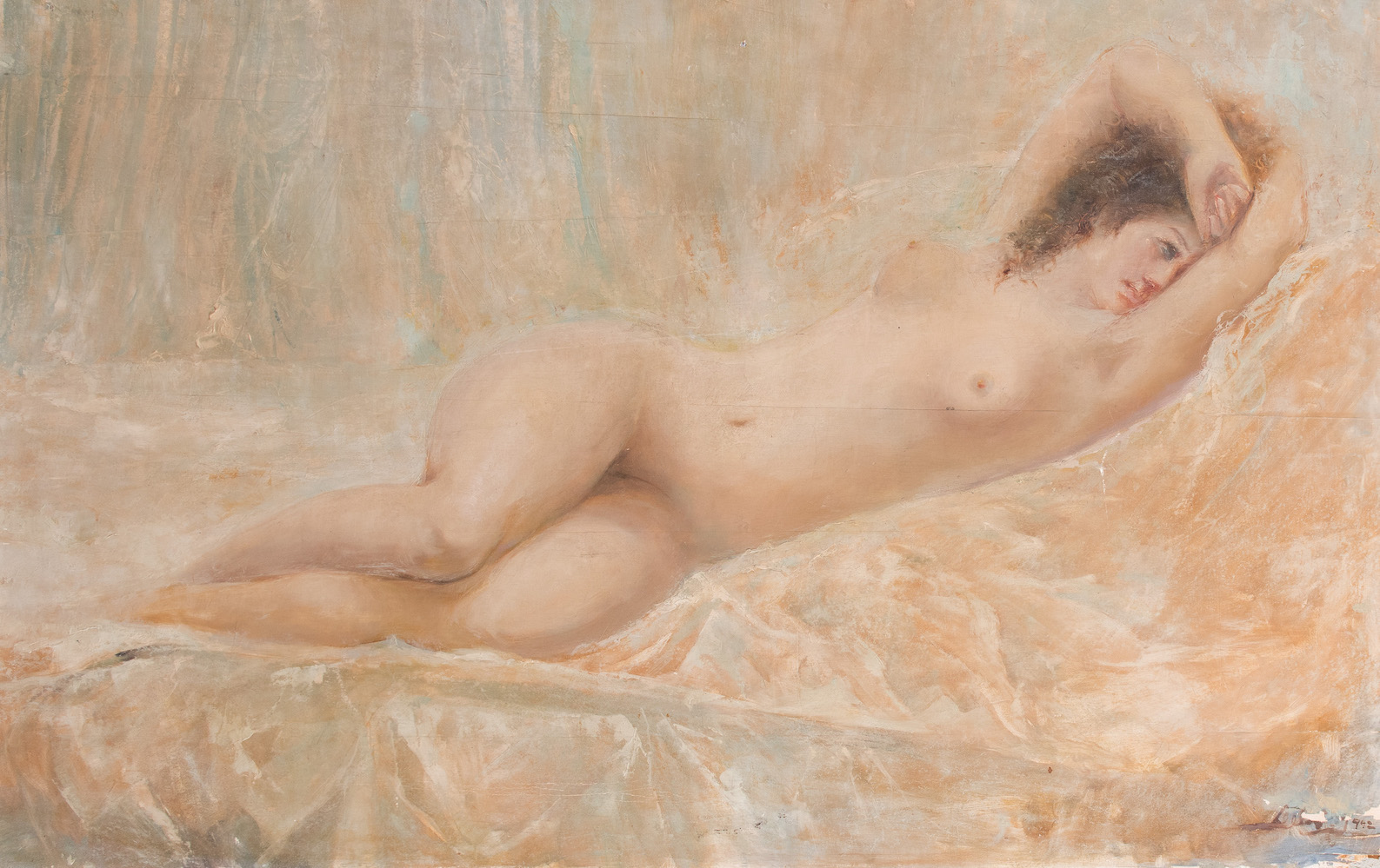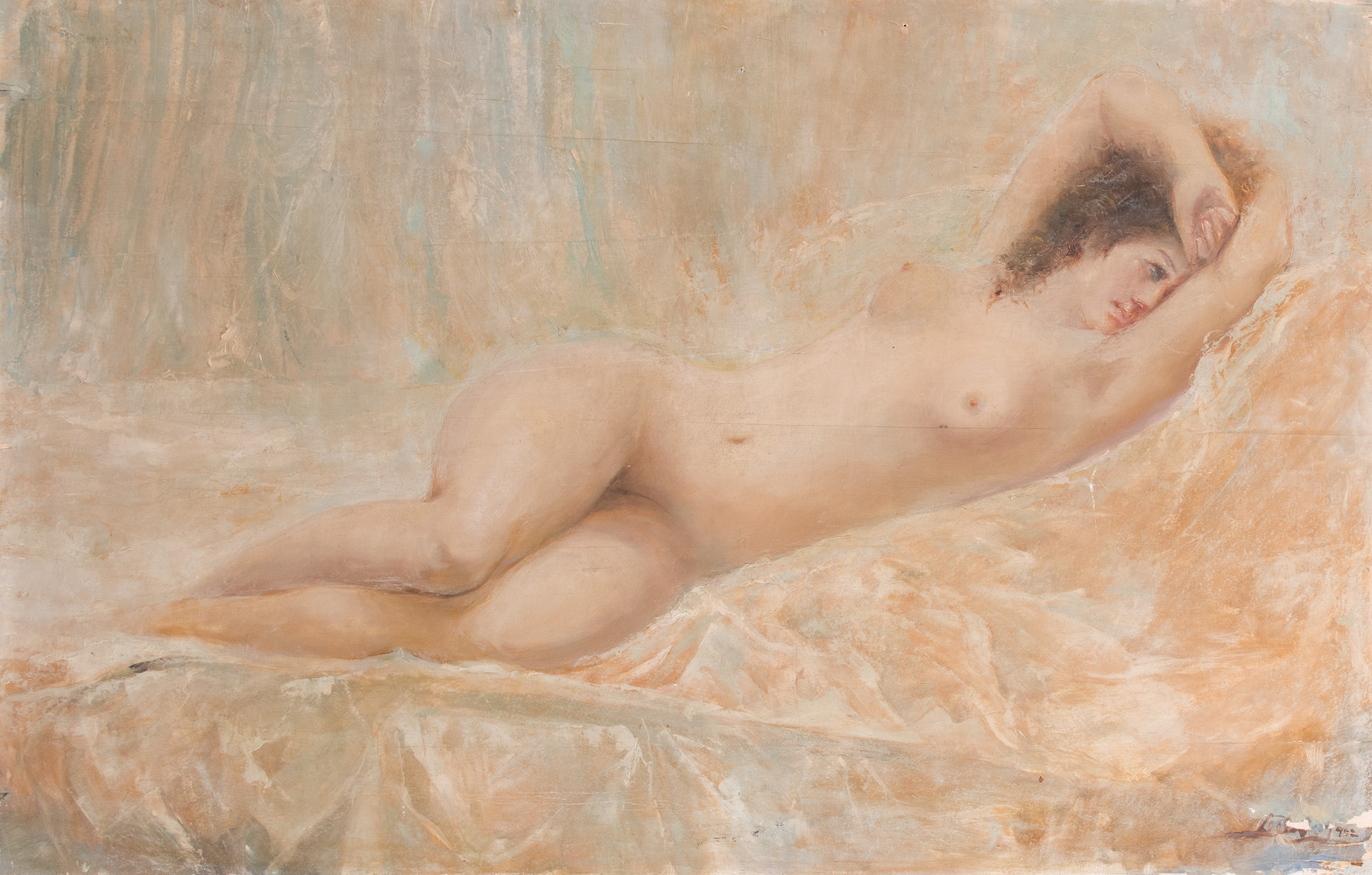 Pittore del XX secolo. "Grande nudo disteso", 1942. Olio su tavola. Opera...
