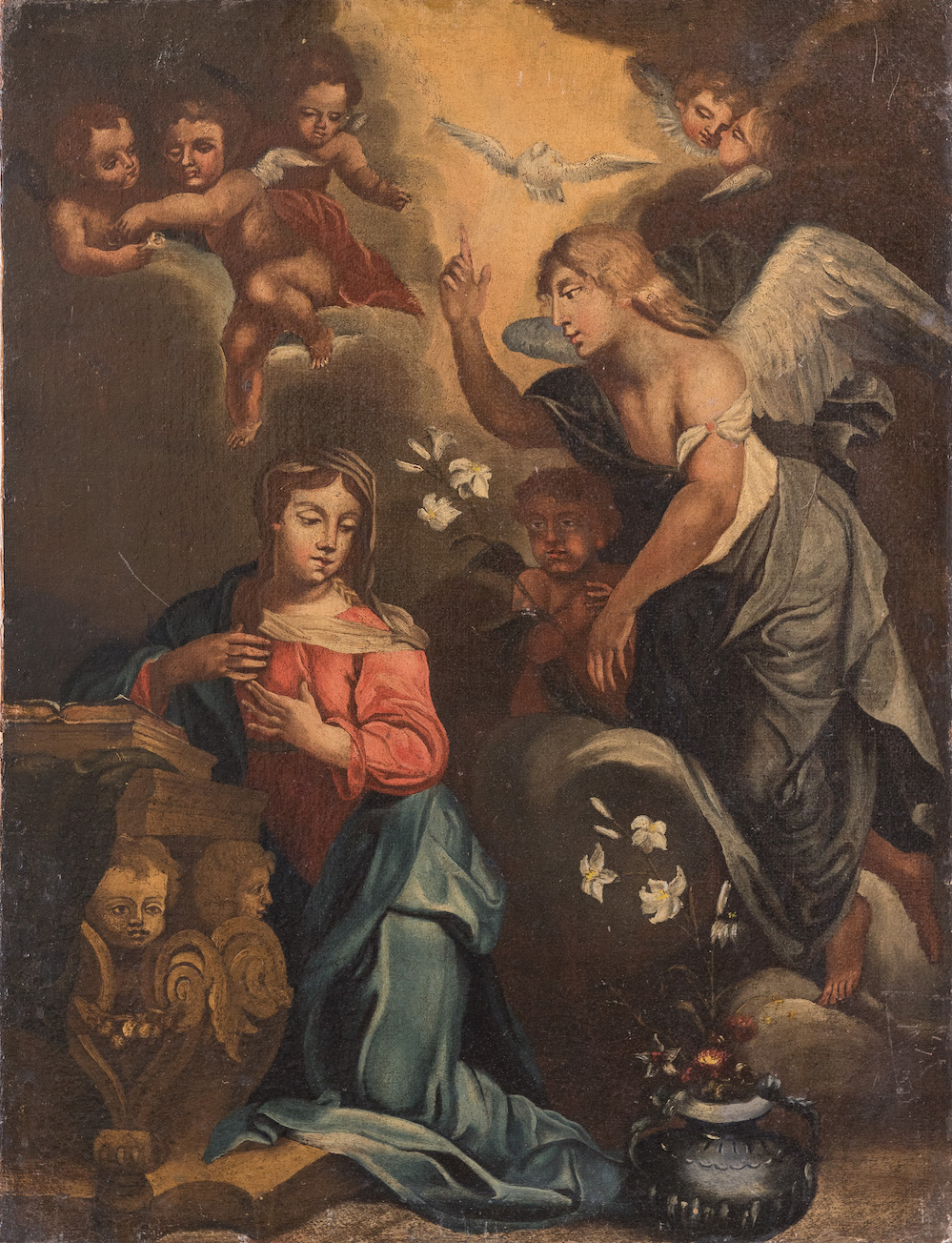 Maestro del XVII secolo. "Annunciazione". Olio su tela. Cm 61x47.