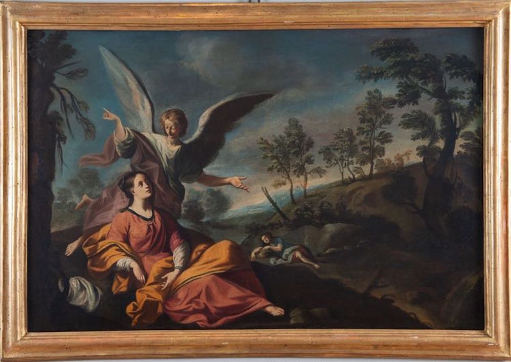 Maestro emiliano del XVIII secolo. "Agar e l’Angelo”. Olio su tela. Cm 74x113.