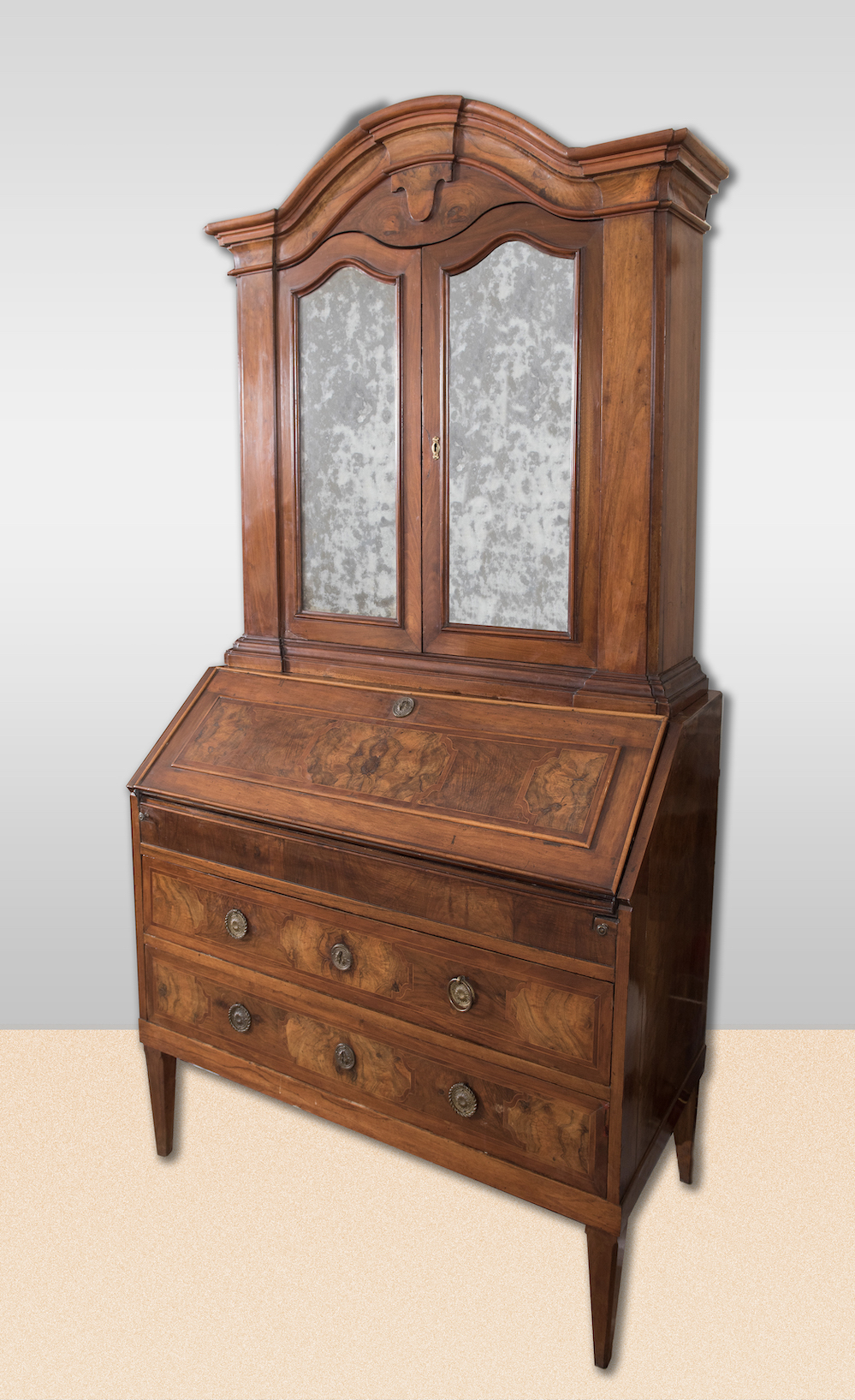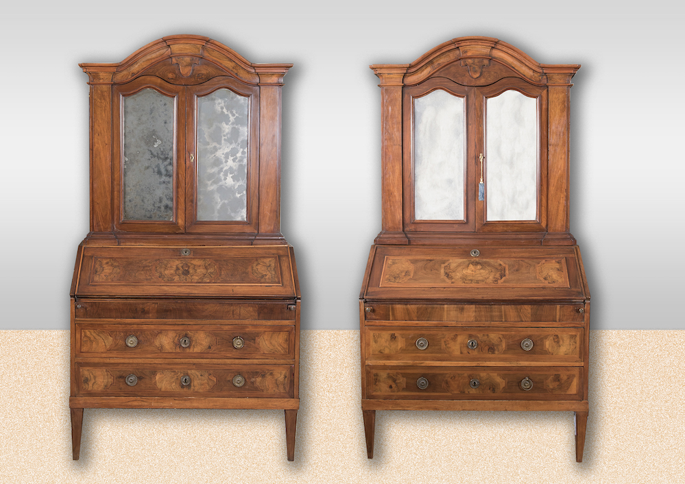 Coppia di trumeau in massello di noce. Emilia o Lombardia, ultimo quarto del XVIII secolo. Lastronato e filettato in noce, radica di noce e ciliegio. Cadauno di cm 220x115x55.