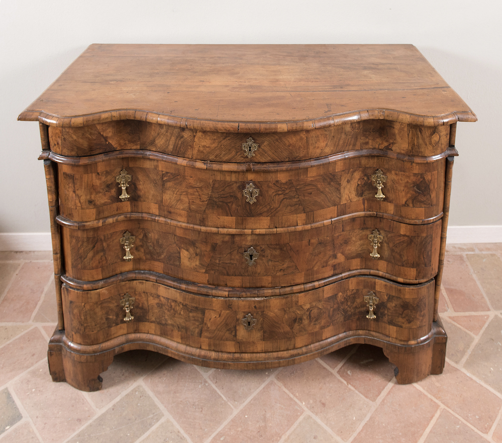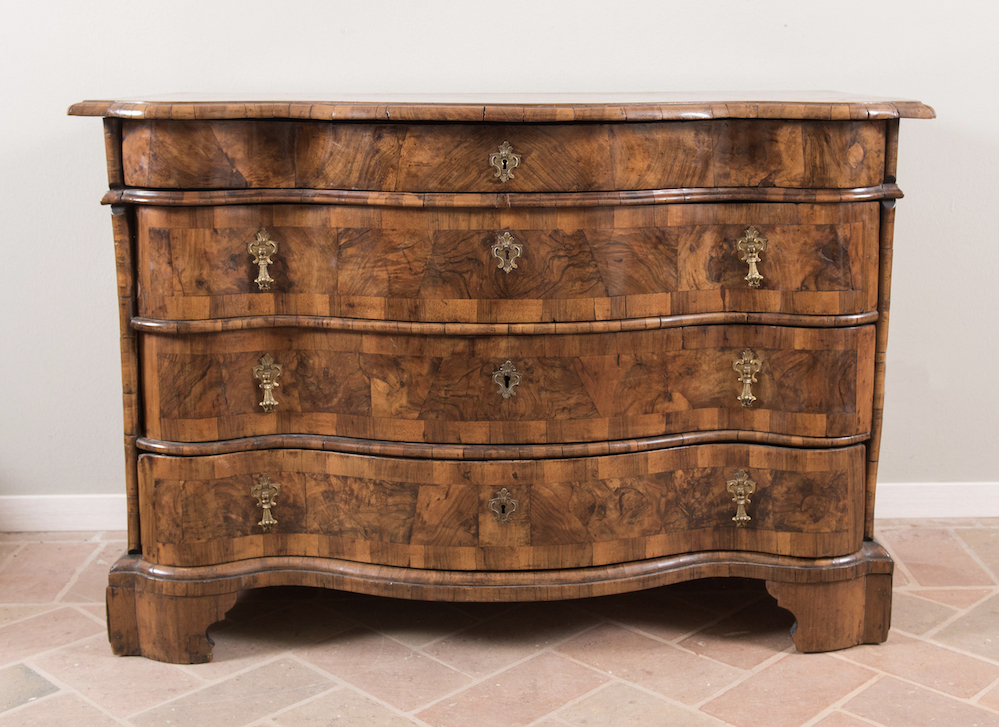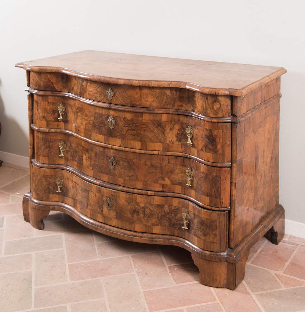 Cassettone a quattro cassetti. Primo quarto del XVIII secolo. Reca il fronte mosso lastronato in radica di noce e rigatino, fianchi e lati in massello. Cm 85,5x125x63.