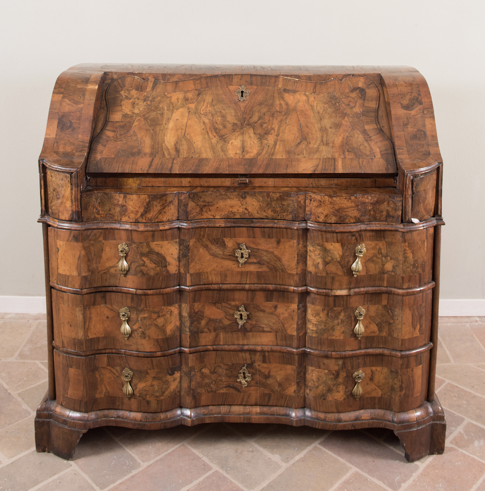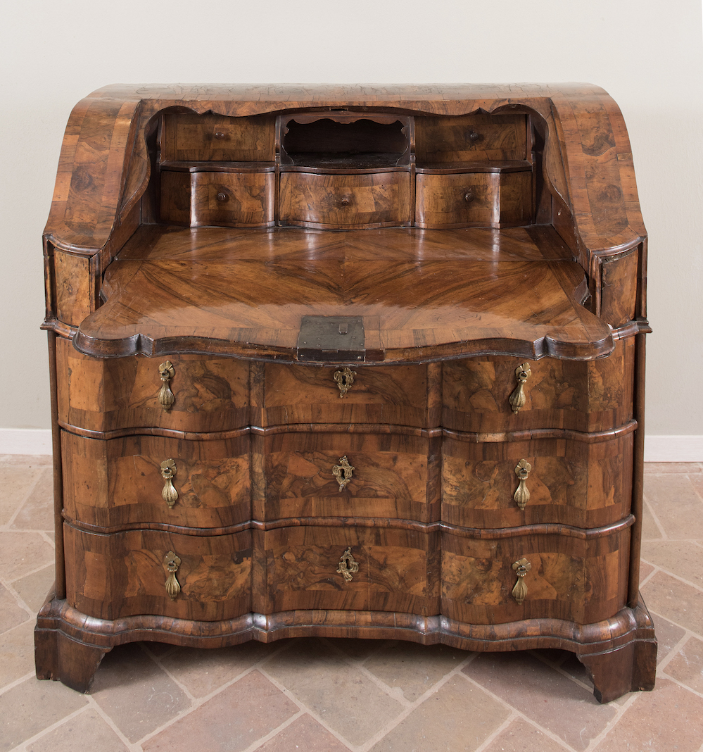 Ribalta a tre cassetti. Emilia, metà del XVIII secolo. Lastronata in noce e radica di noce. Reca calatoia mossa e scatabattolo interno con cassettiera dall'andamento sinuoso e degradante all'interno. Cm 112x116x59.