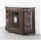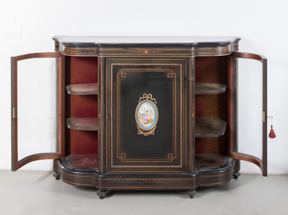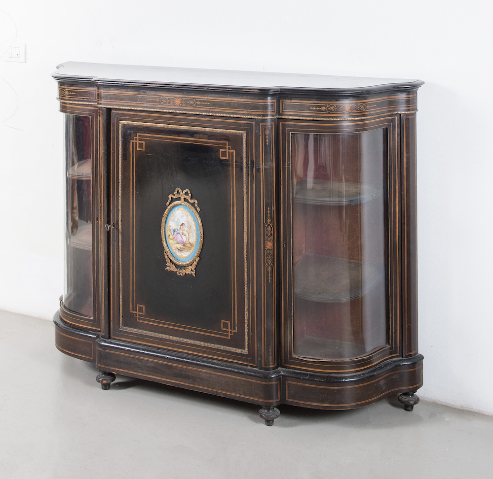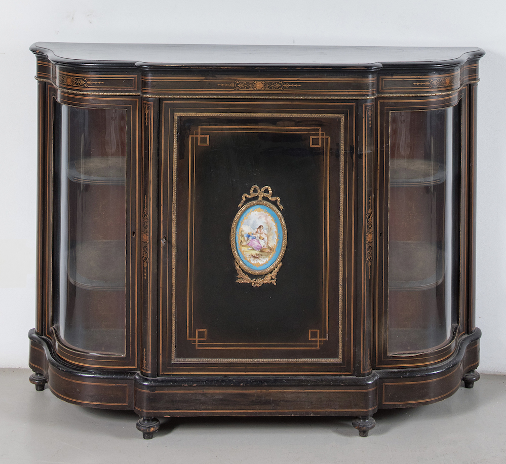 Credenzino. Francia, fine del XIX secolo. Lastronato in legno ebanizzato, filettato in acero e legni colorati con applicazione nell'anta centrale di una placca in porcellana di Sevres con cornice in bronzo dorato. Le ante laterali sono mosse e recano vetri. Cm 110x147x39.