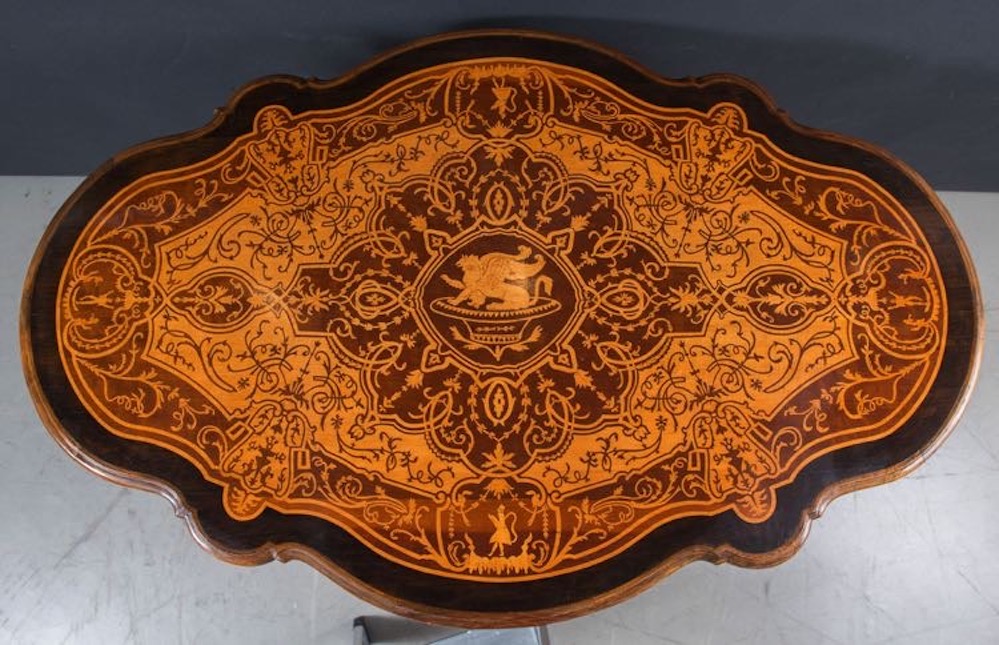 Elegante tavolo da salotto, in massello di noce. Italia, seconda metà del XIX secolo. Con piano lastronato ed intarsiato in acero e palissandro. Elegante grifone intarsiato al centro, inconiciato da volute fitomorfe. Cm 81x127x80. (difetti)