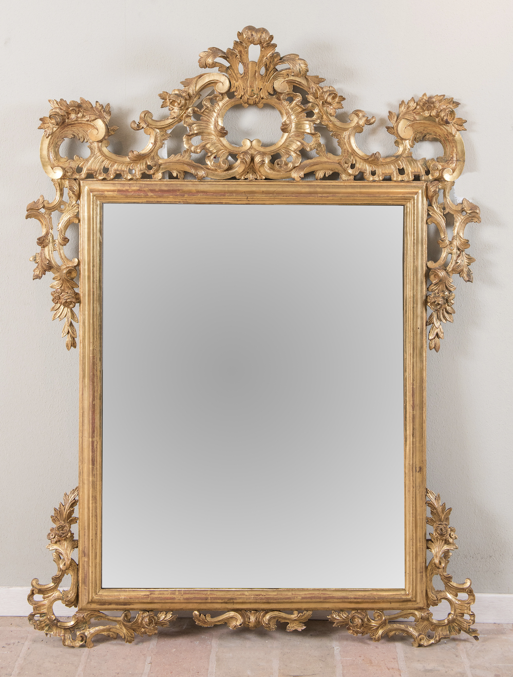 Specchiera lignea dorata. Ad imitazione del XVIII secolo, ma realizzata nel XX secolo. Cm 152x108. (rotture e mancanze)