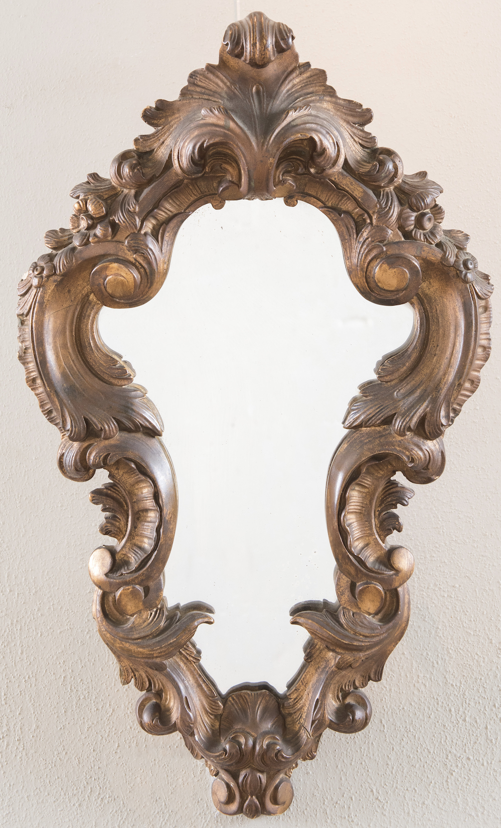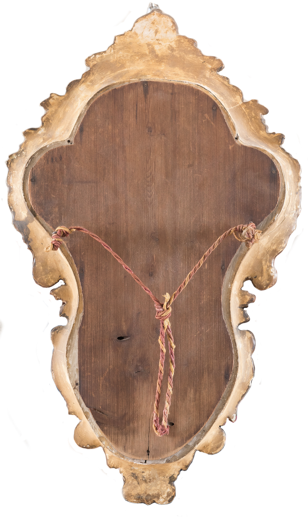 Specchiera sagomata in scagliola dorata. Metà del XIX secolo. Cm 63x38.