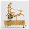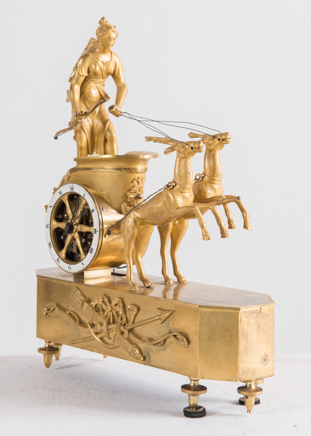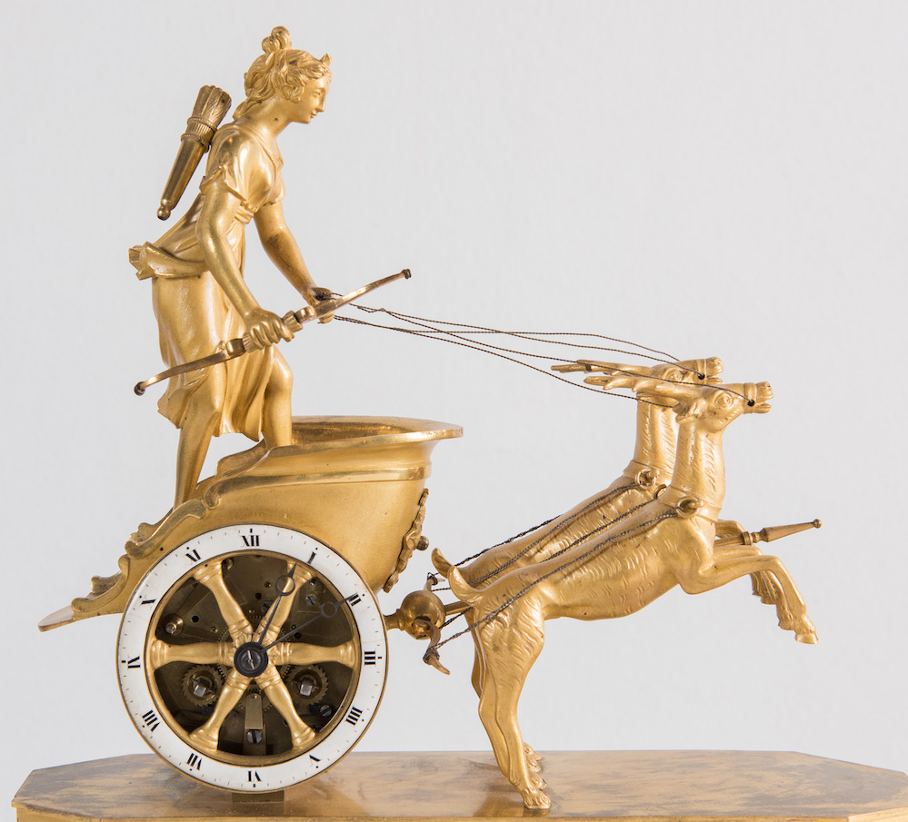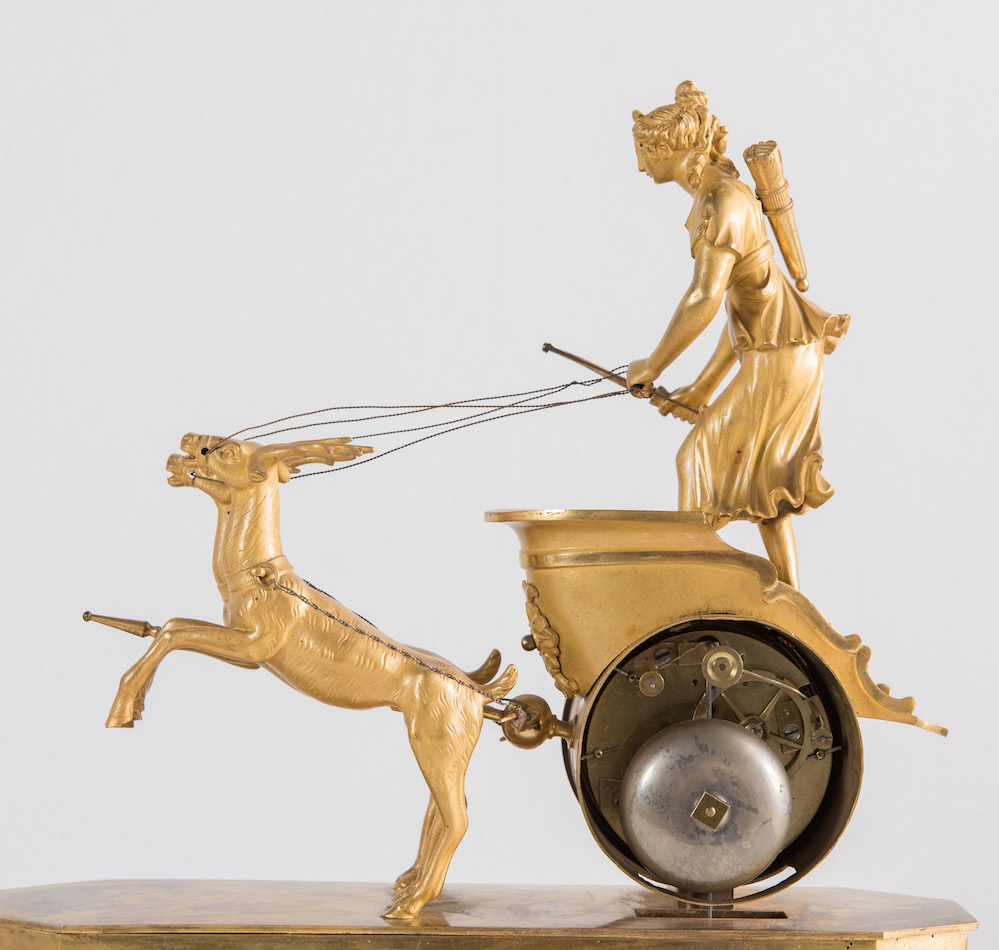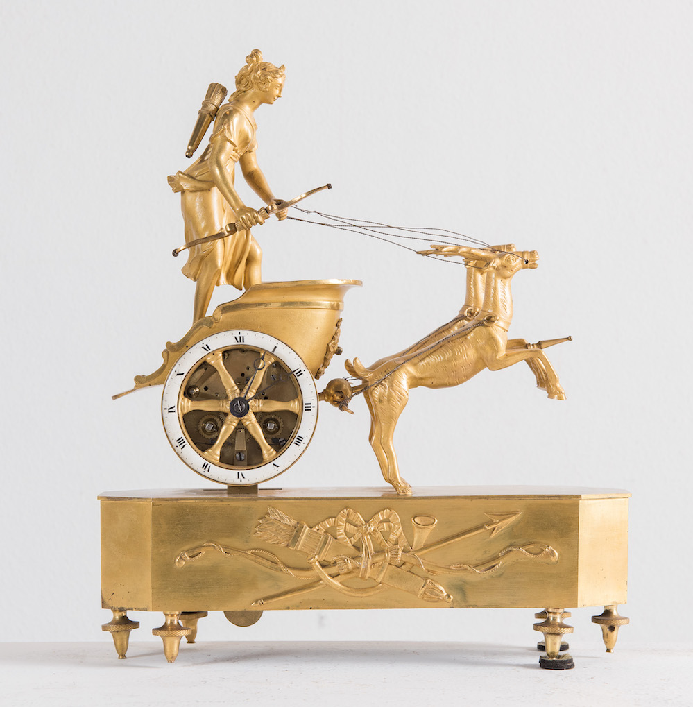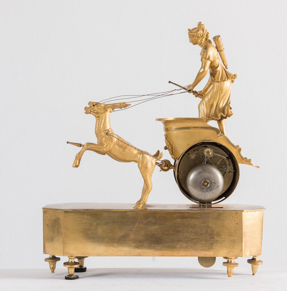 OROLOGIO in bronzo dorato. Francia, prima del XIX secolo. Raffigurante biga con cervi guidata da Diana cacciatrice. Cm 32x27,5x8.