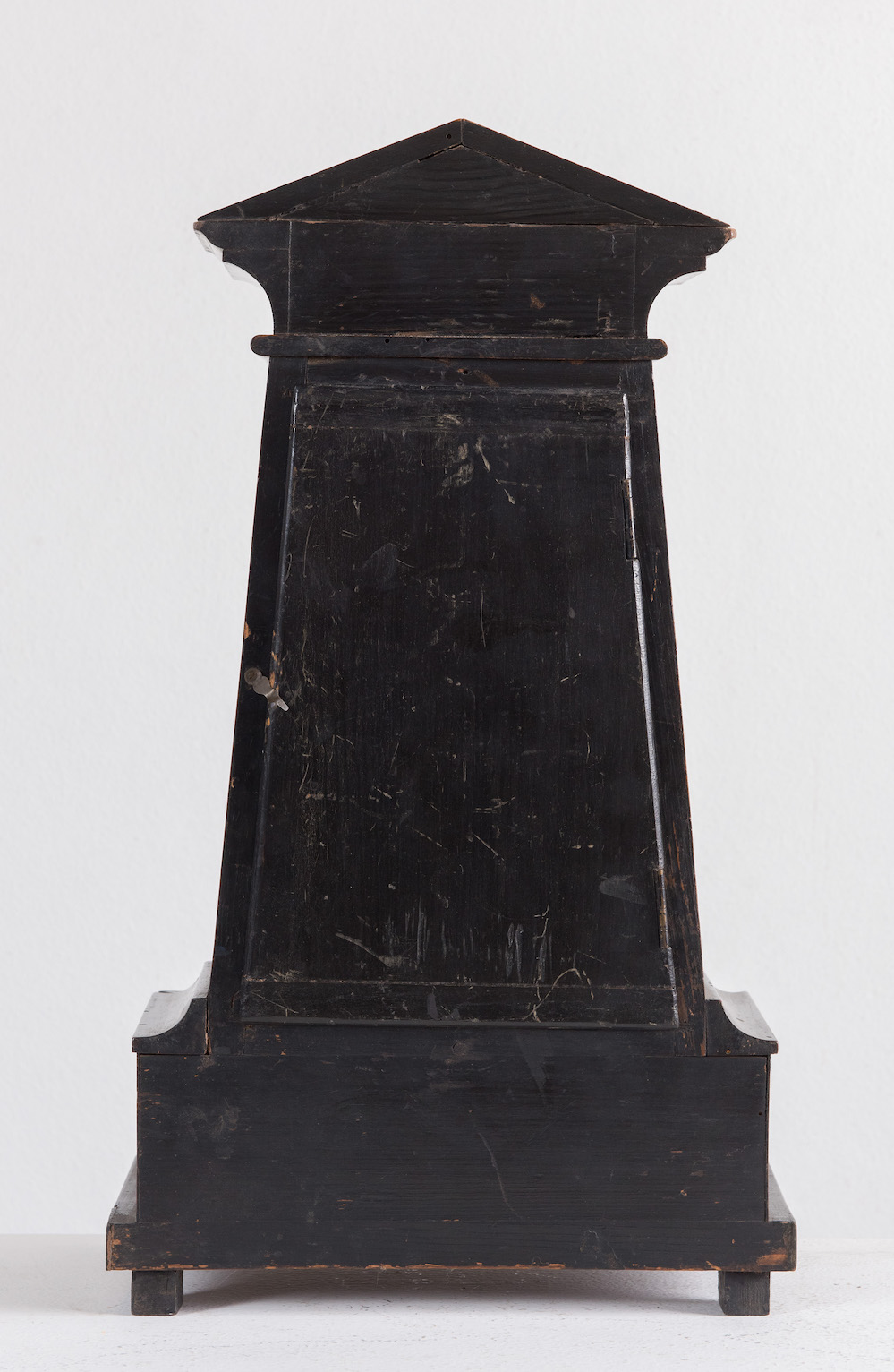 Orologio in legno laccato con scene a cineserie. Prima metà del XIX secolo....