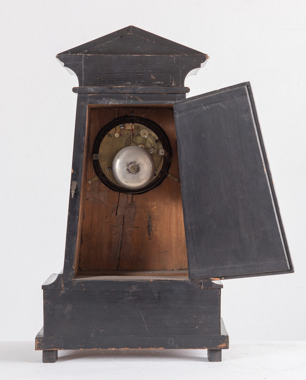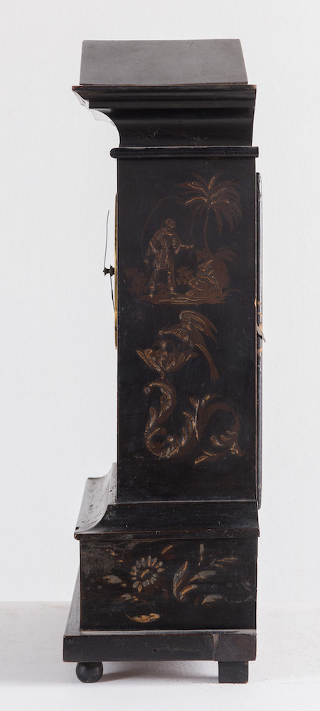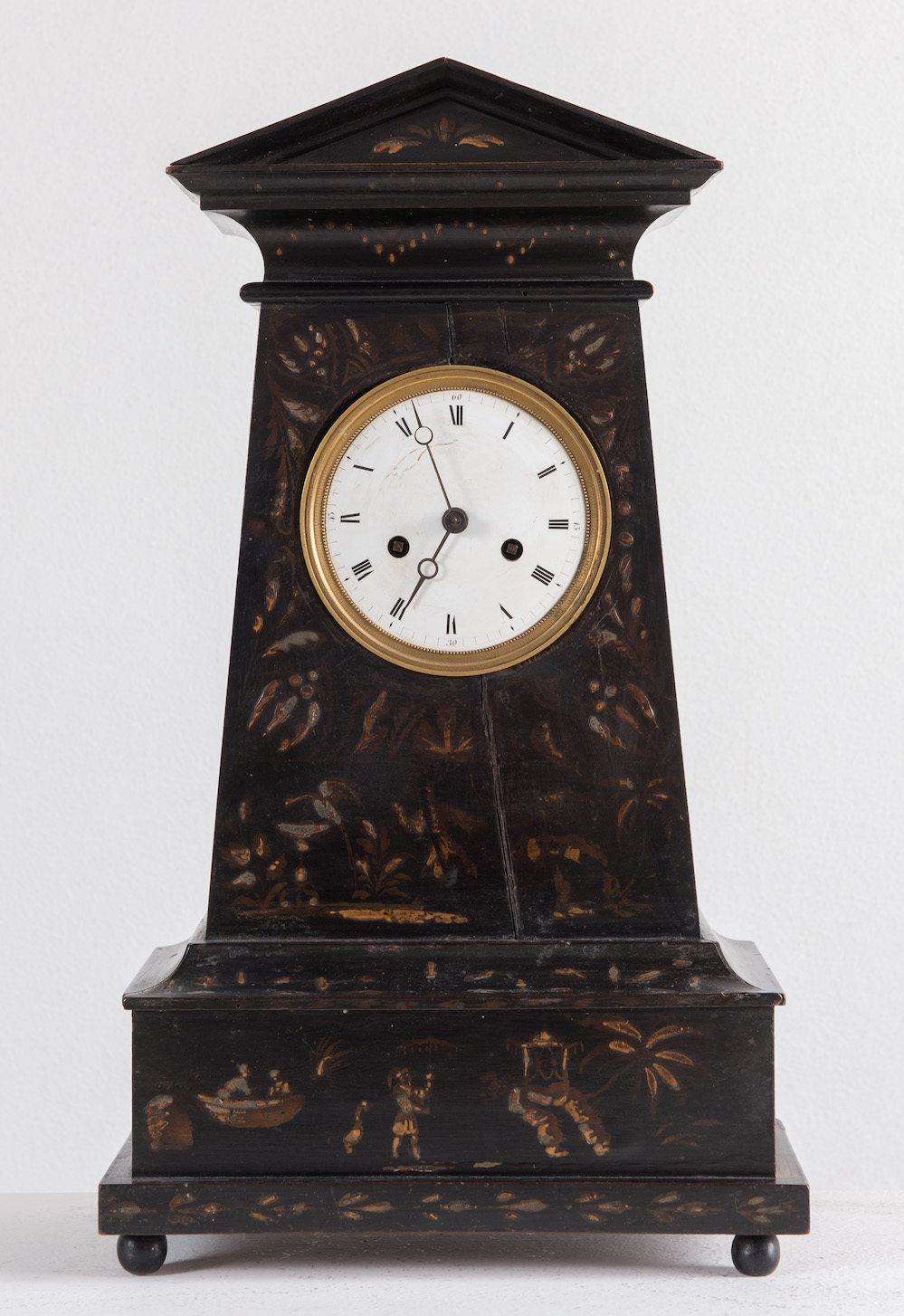 Orologio in legno laccato con scene a cineserie. Prima metà del XIX secolo. Cm 47x27x13,5.