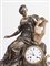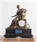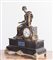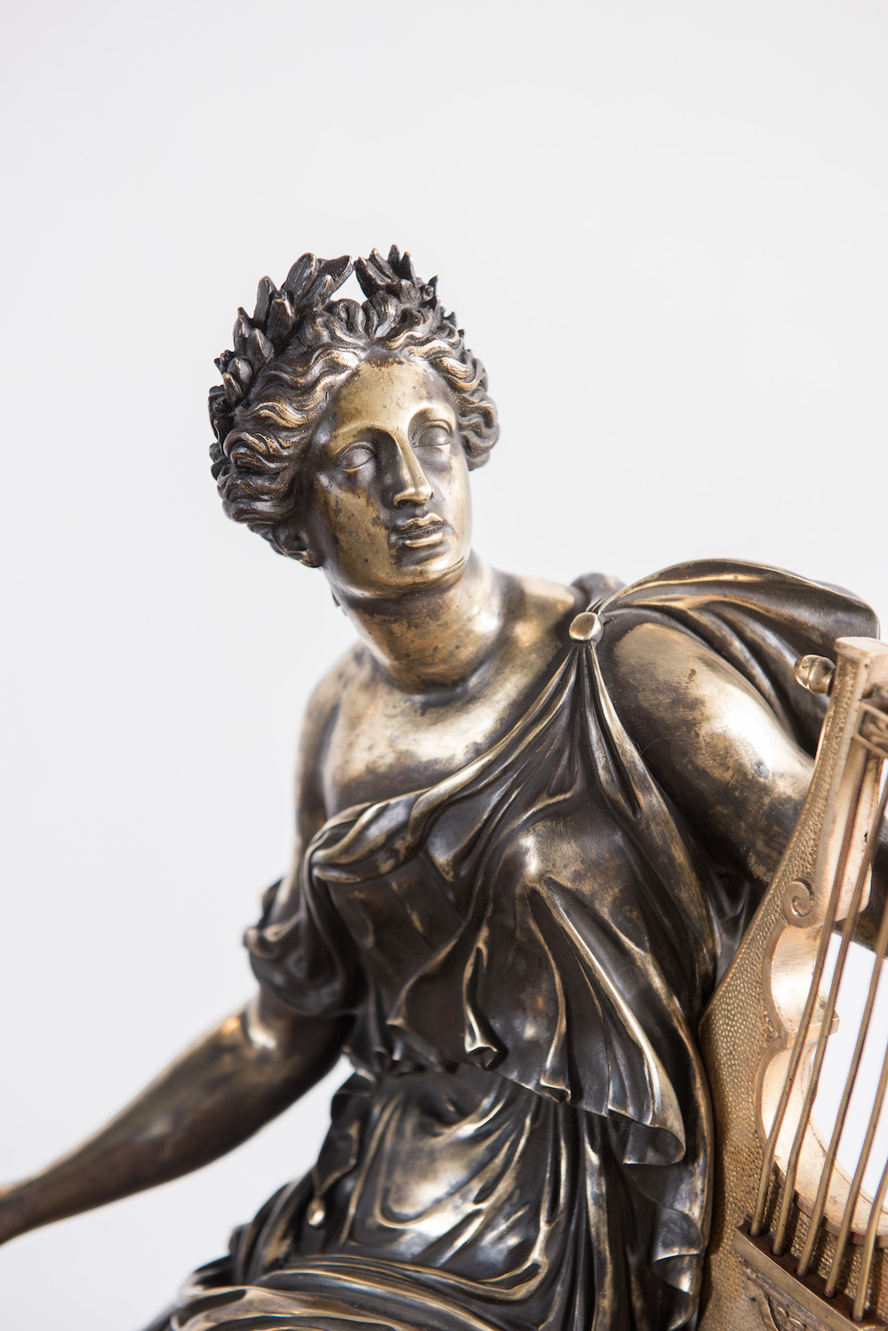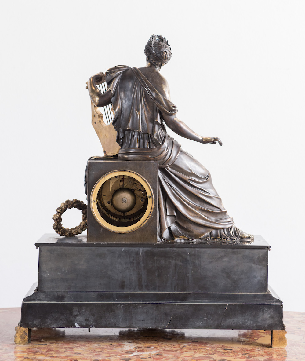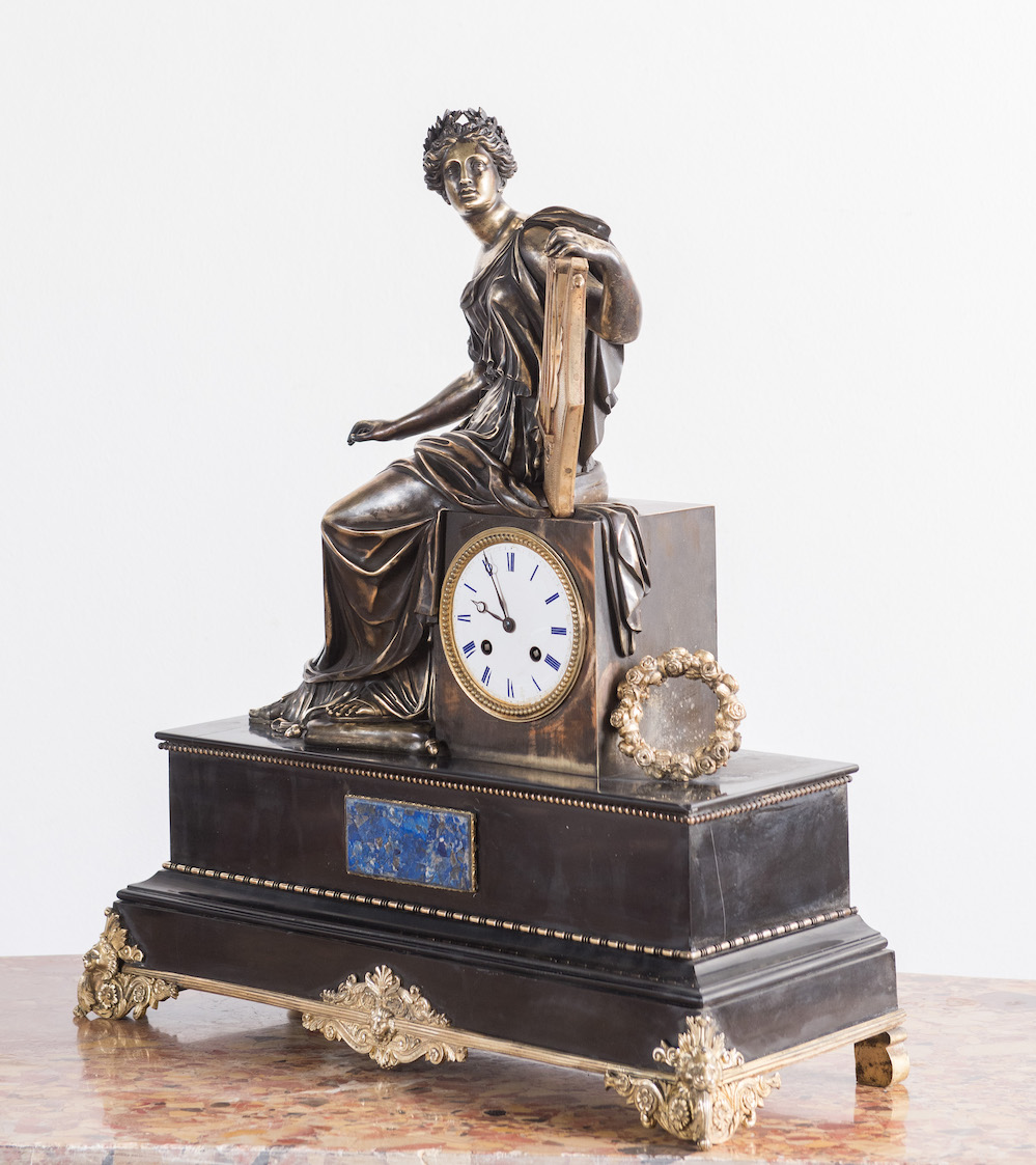 Grande orologio. XIX secolo. Reca figura in bronzo parzialmente argentato, raffigurante l'allegoria della musica, e base in marmo nero del Belgio con applicazione centrale in lapislazzuli.