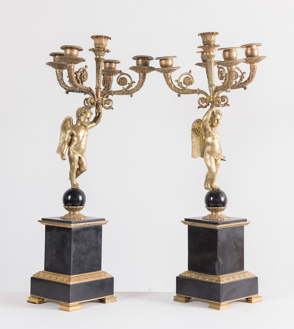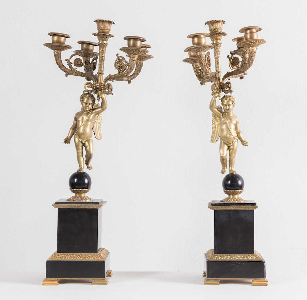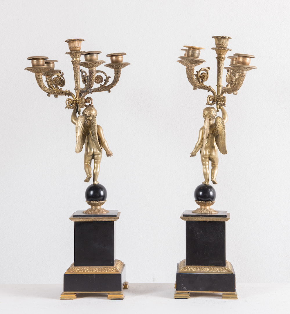 Coppia di candelabri. Fine del XIX secolo - inizi del XX secolo. Di gusto impero, recano base in marmo nero e bronzo. Formati da putti poggianti su sfera che reggono con una mano le braccia porta candela. H. Cm 56.