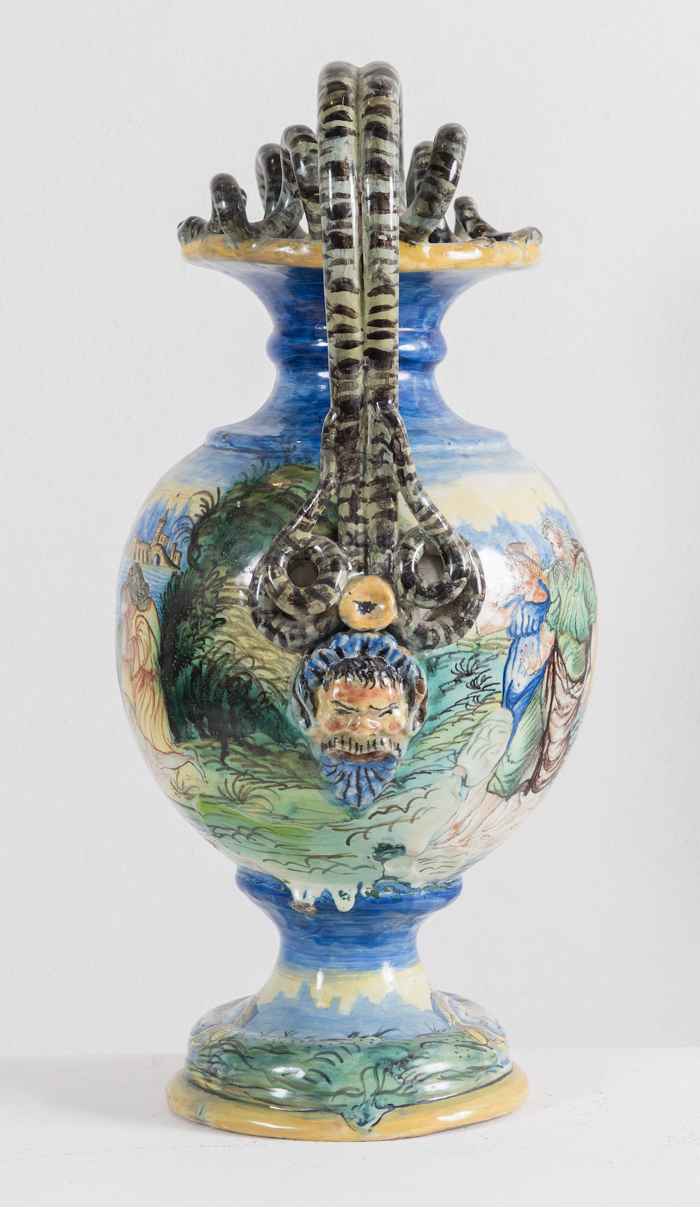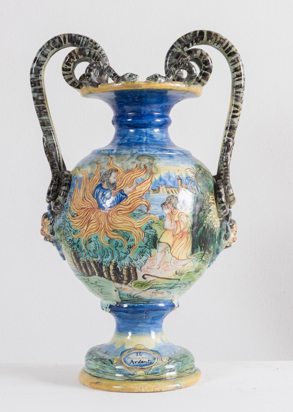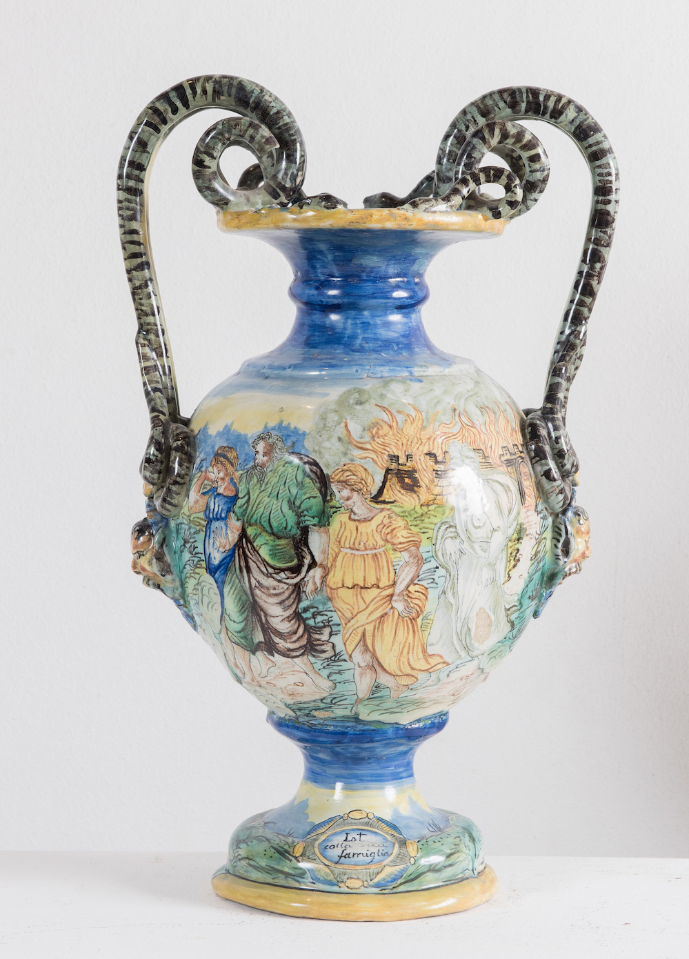 Vaso istoriato. Pesaro, fine XIX - inizi XX secolo. Reca due scene raffiguranti il roveto ardente e Loth con la sua famiglia che si allontana da Gomorra. Reca manici a guisa di serpente. Cm 47x29x25. (lievi rotture)