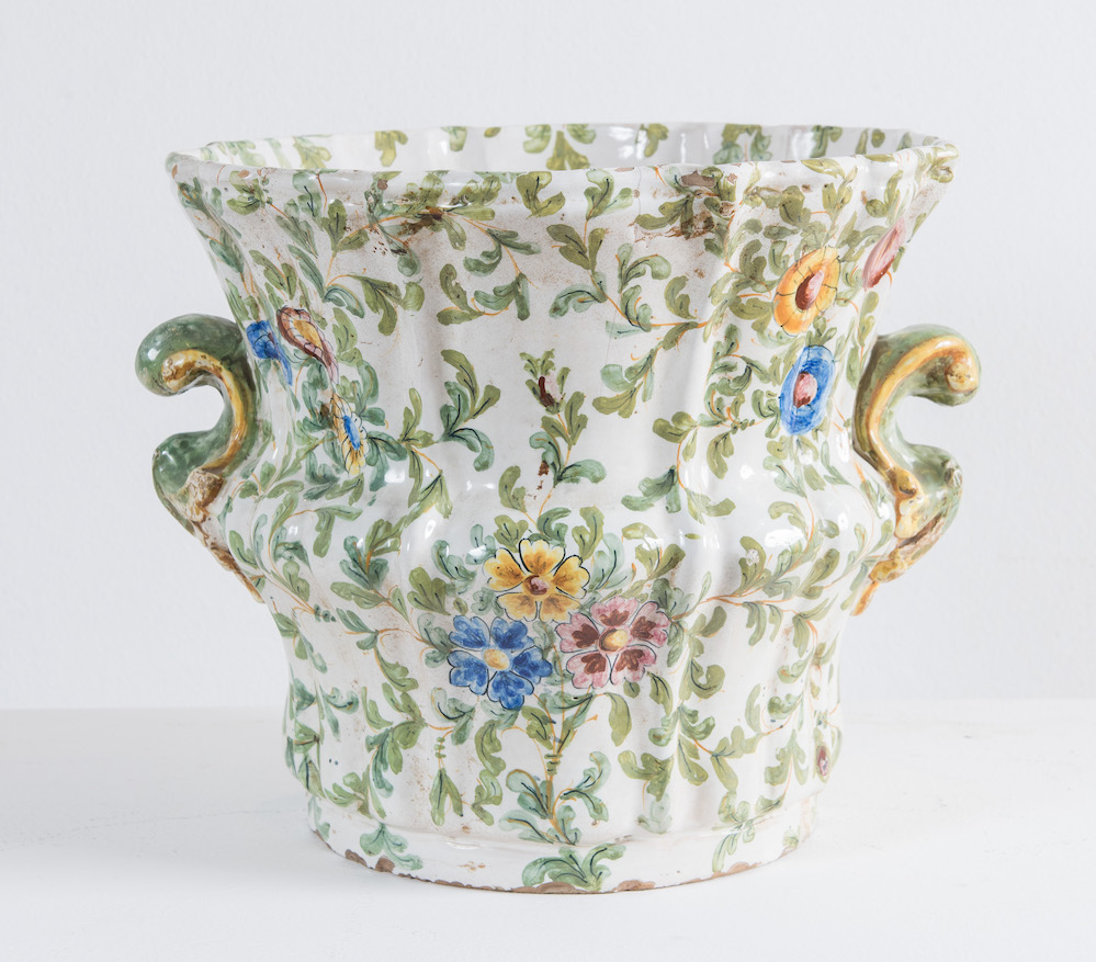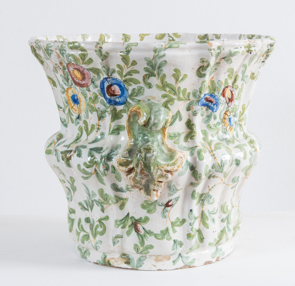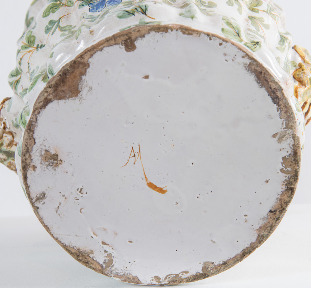 ANGELO MINGHETTI, Bologna, XIX secolo. Importante vaso in ceramica smaltata. Cm 29,5x37x33,5. Sotto la base reca sigla AM. (difetti)