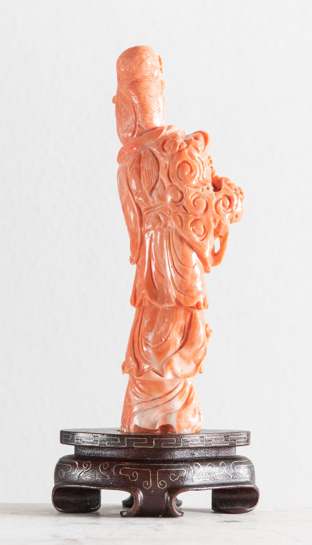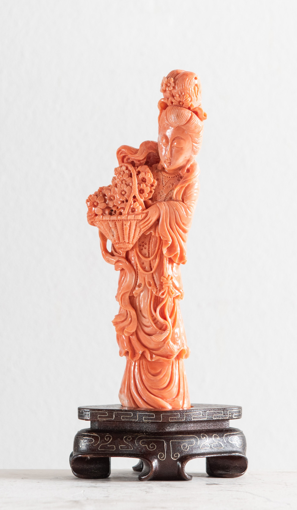 "Geisha con cesto di fiori". Scultura in corallo. Peso 322,10 gr. Cm 19,5x6,5x3.