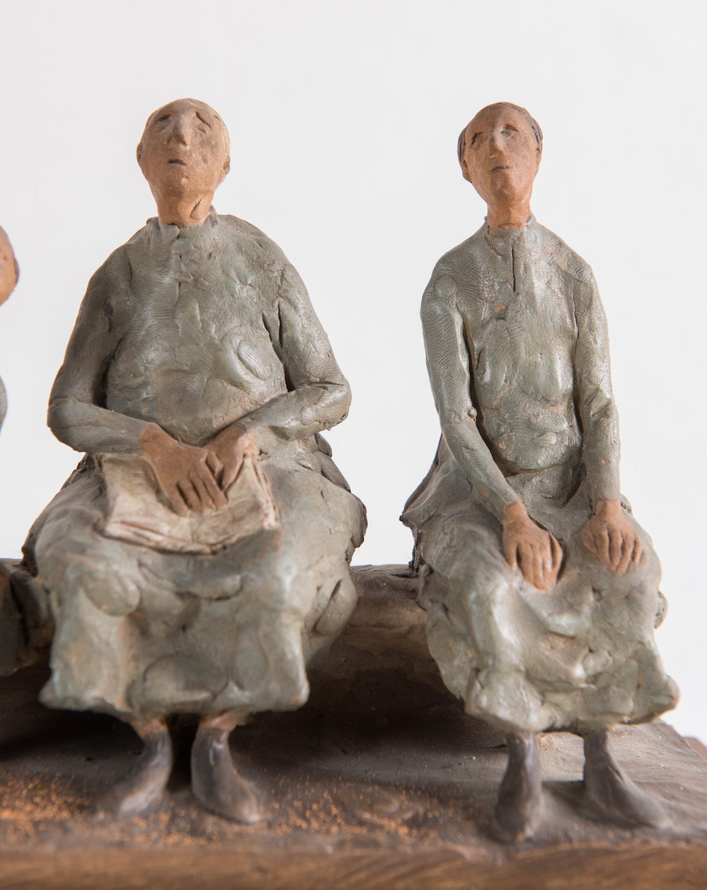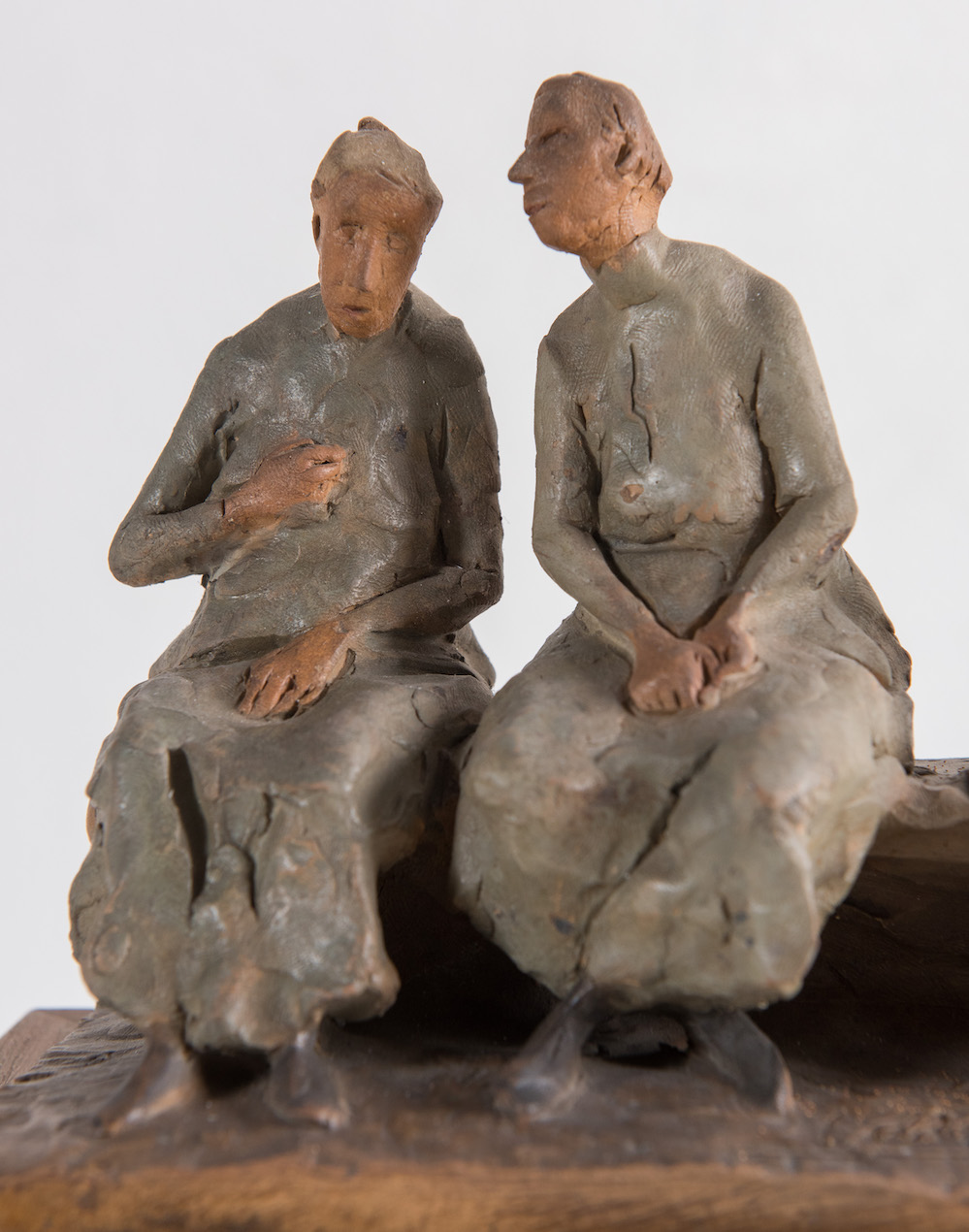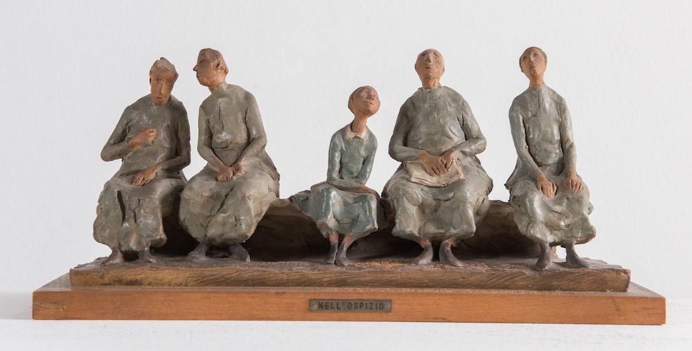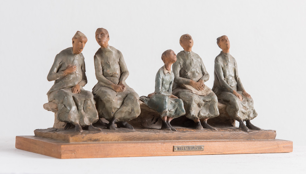 CLETO TOMBA (Castel San Pietro Terme 1898 - Bologna 1987) "Nell'ospizio". Scultura in terracotta policroma. Cm 14,5x32,5x12. Opera firmata alla base Tomba. Reca marchio a fuoco CT. Provenienza: importante collezione privata, Bologna.