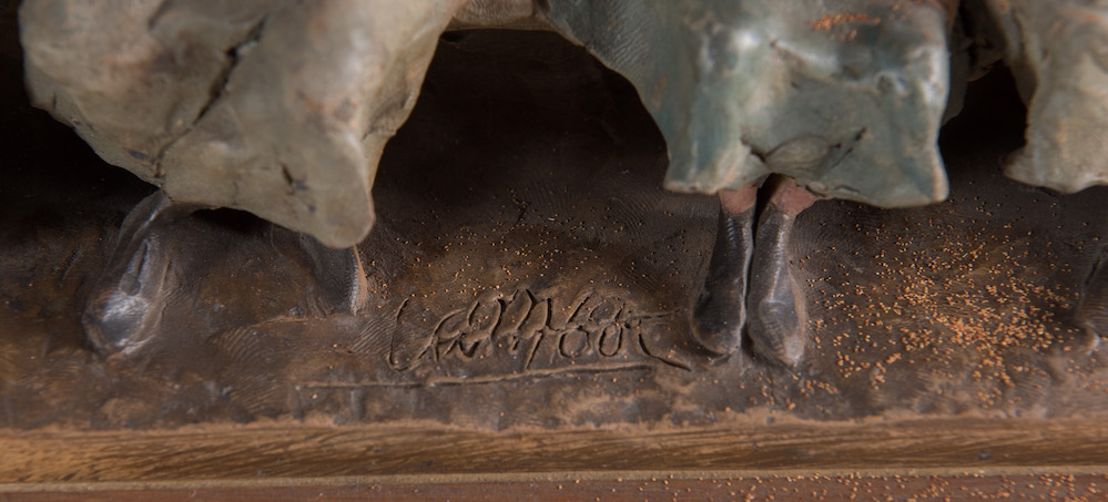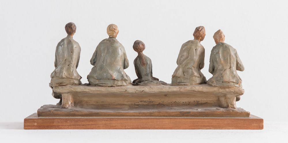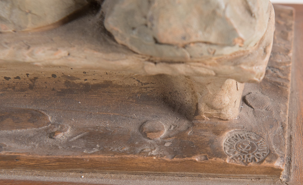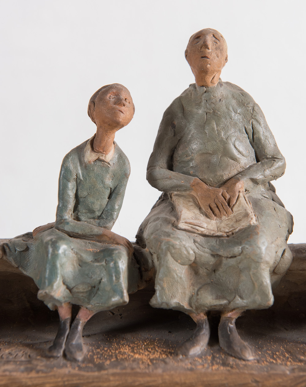 CLETO TOMBA (Castel San Pietro Terme 1898 - Bologna 1987) "Nell'ospizio". Scultura in terracotta policroma. Cm 14,5x32,5x12. Opera firmata alla base Tomba. Reca marchio a fuoco CT. Provenienza: importante collezione privata, Bologna.