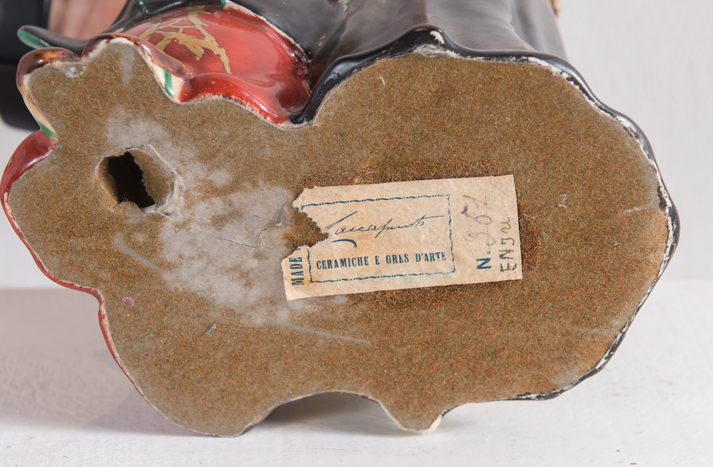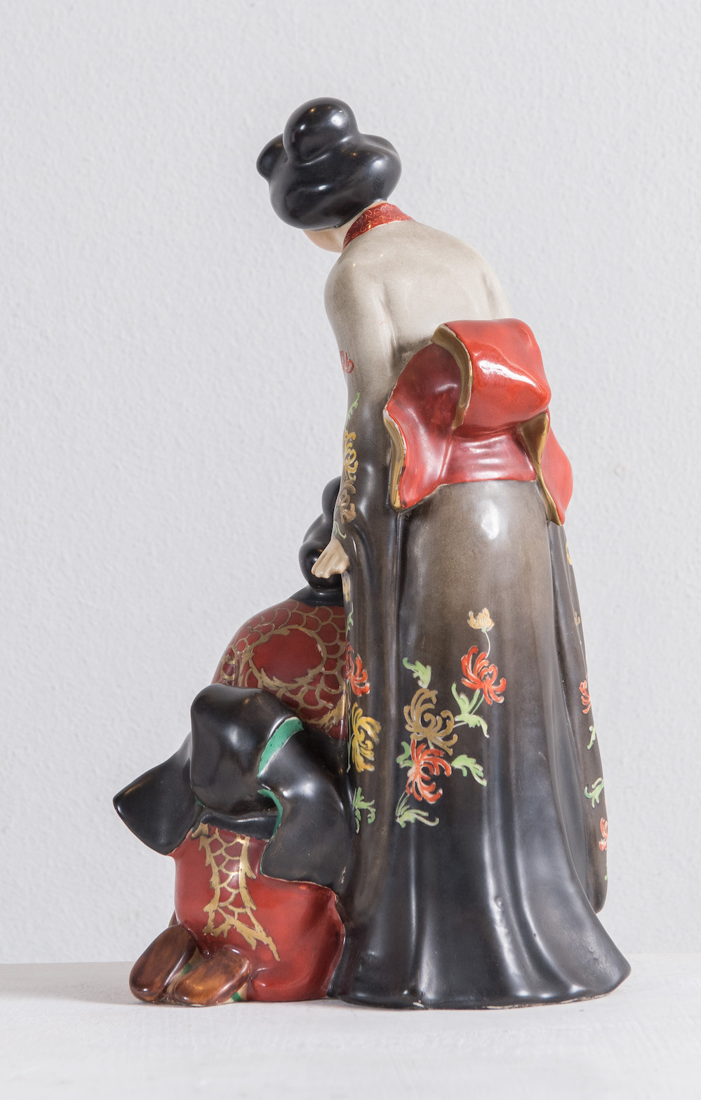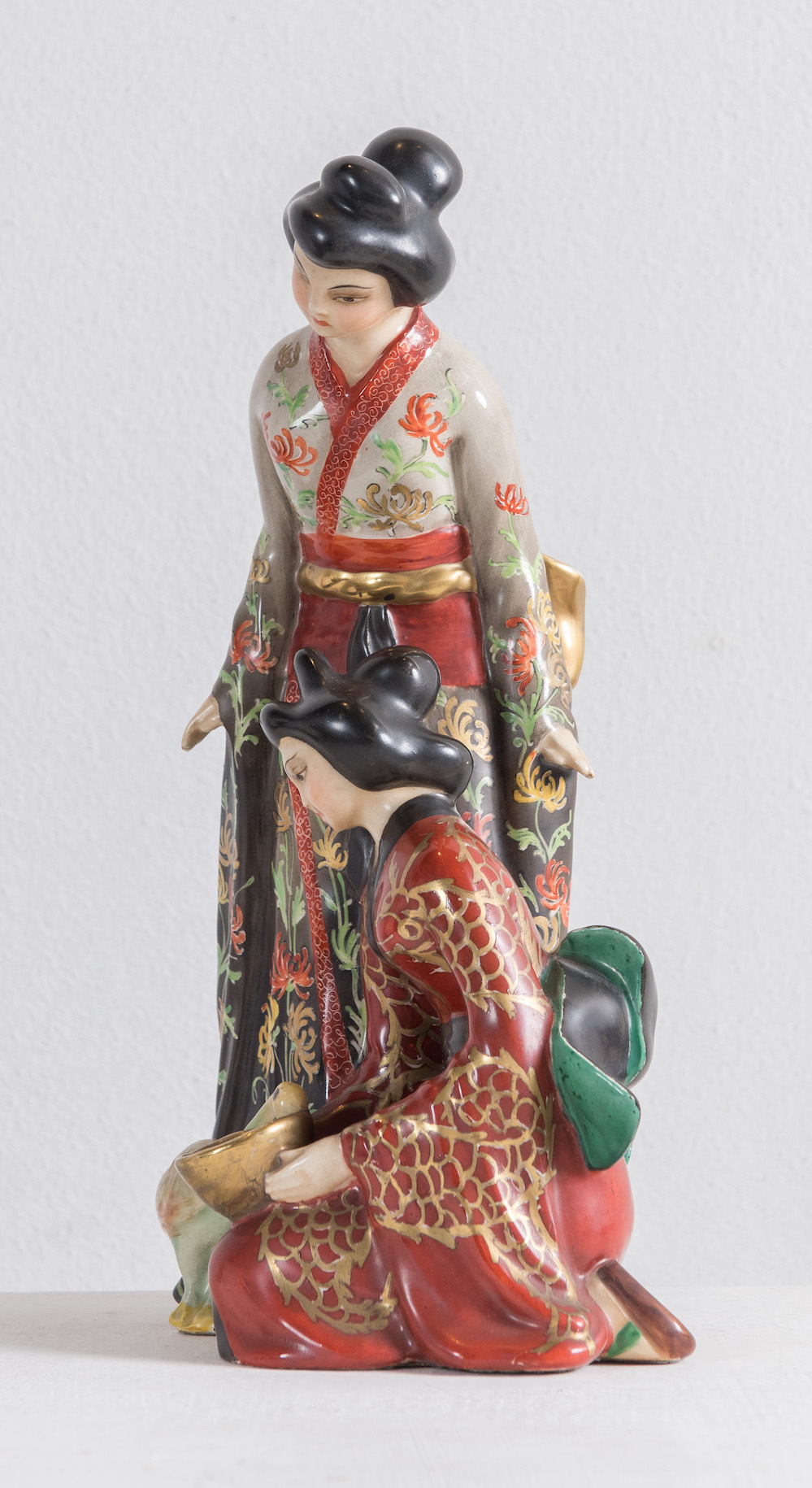 GUIDO CACCIAPUOTI, XX secolo. "Geishe". Scultura in ceramica smaltata. Cm 30x16x13,5. Sotto la base reca etichetta Cacciapuoti.