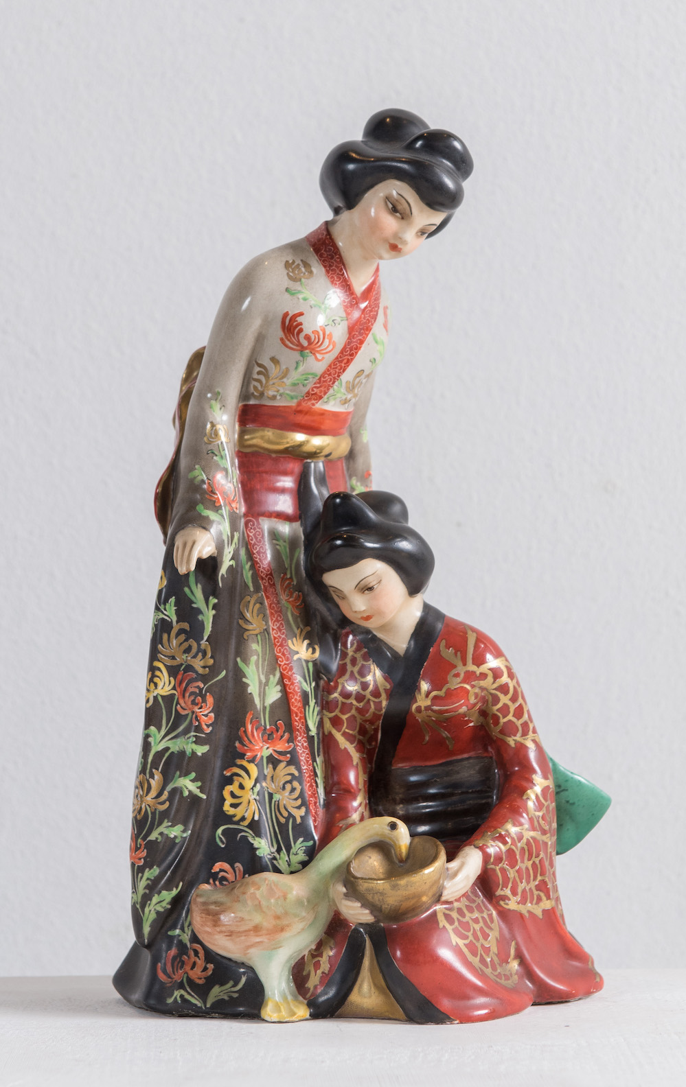 GUIDO CACCIAPUOTI, XX secolo. "Geishe". Scultura in ceramica smaltata. Cm...