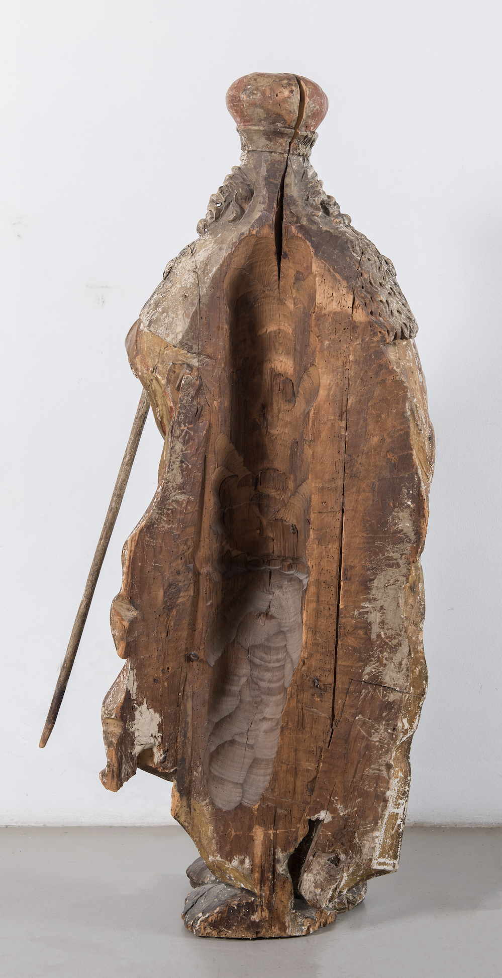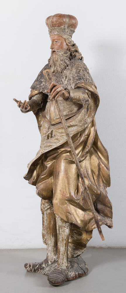 "Personaggio del vecchio testamento". Scultura lignea policroma. Metà del XVIII secolo. Parzialmente dorata e argentata. Cm 139x61x42.
