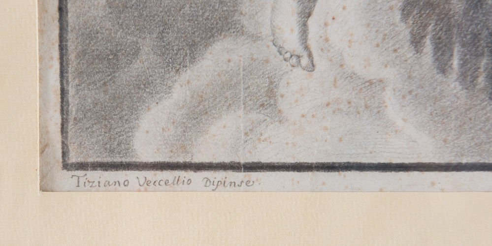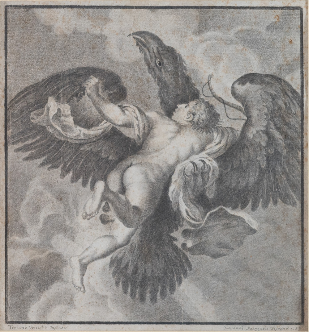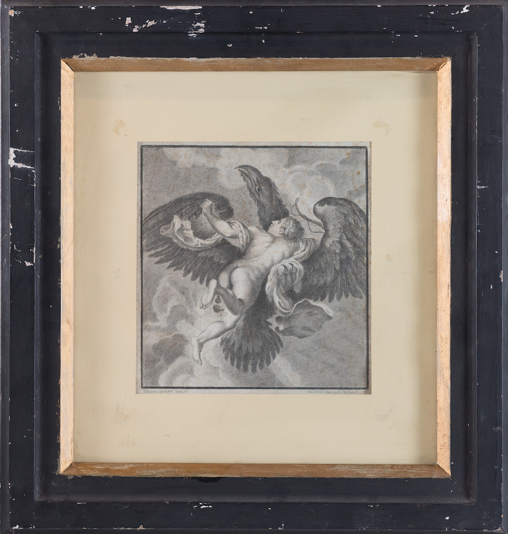 GIOVANNI AGAZZANI (XVIII) "Ratto di Ganimede", 1783. Disegno su carta, su modello di Tiziano Vecellio. Cm 25,5x23,5. Opera firmata e datata in basso a destra Giovanni Agazzani pinsit 1783.