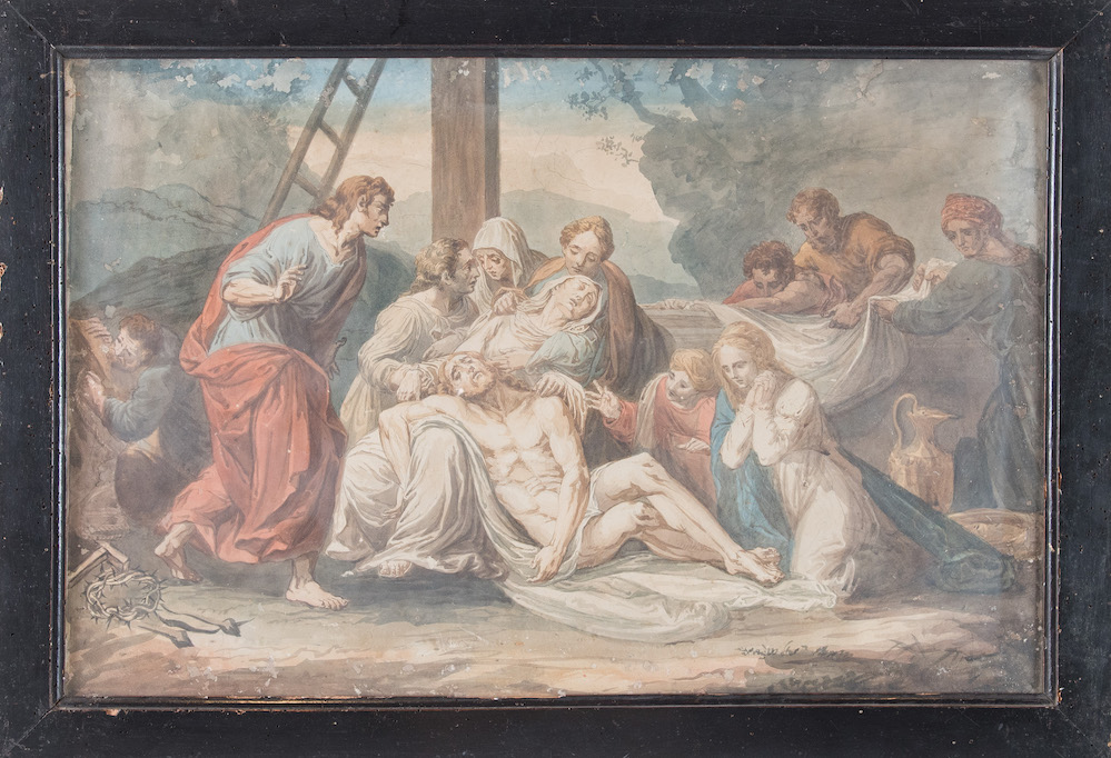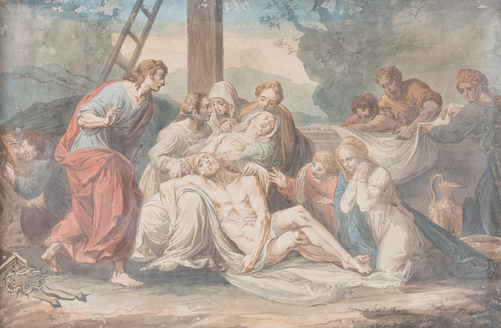 Maestro emiliano della fine del XVIII secolo. "Deposizione". China e acquerello su carta applicata su tela. Cm 48x71.