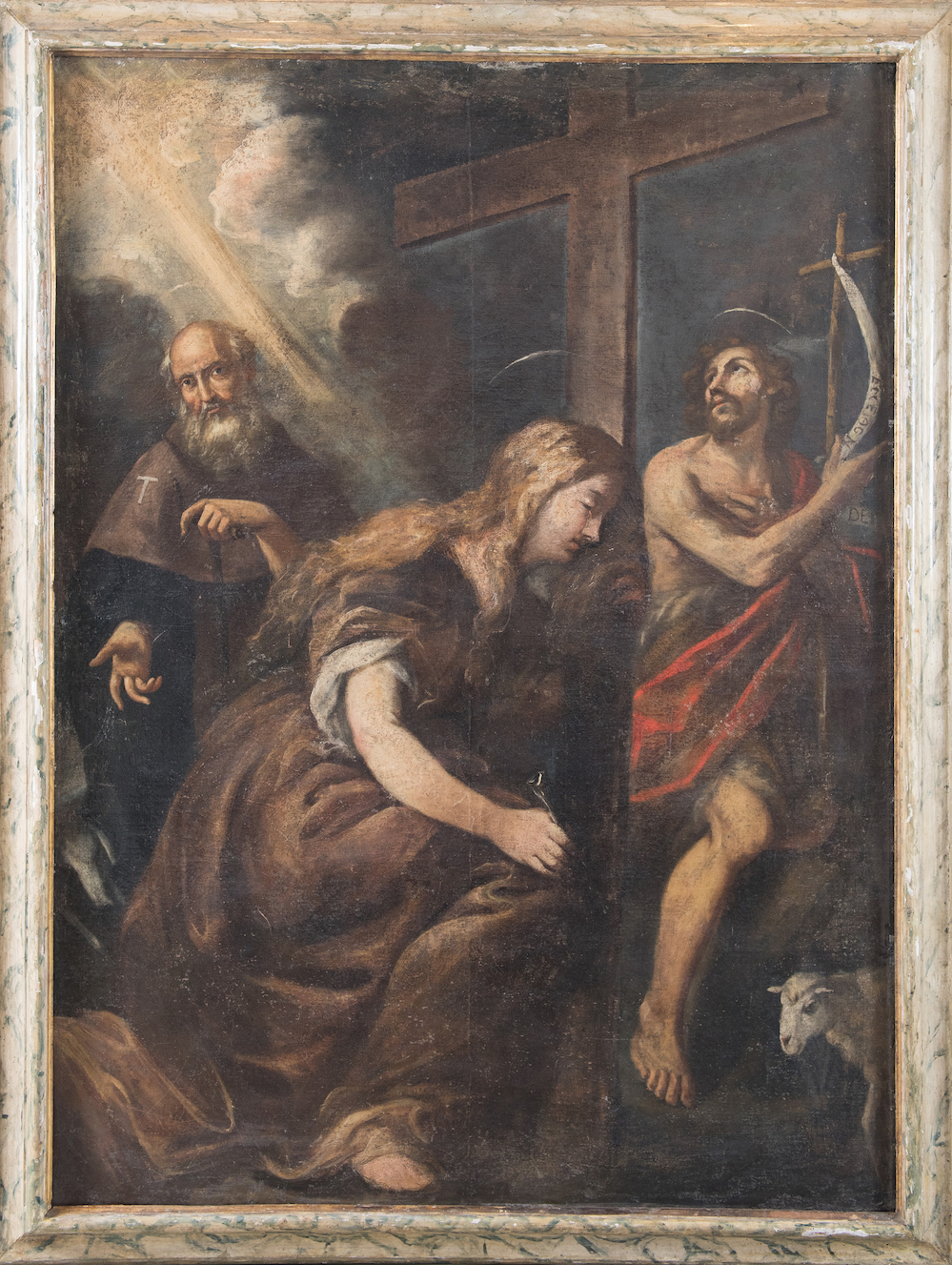 Maestro del XVIII secolo “Maddalena con santi”. Olio su tela con cornice coeva laccata. Cm 171,5x127.