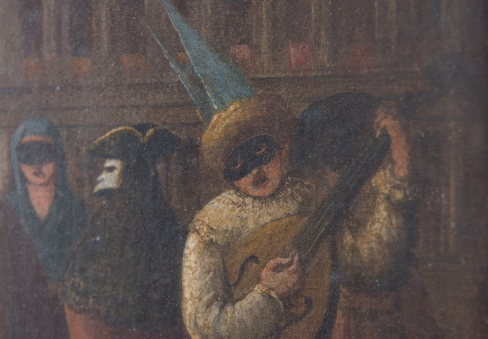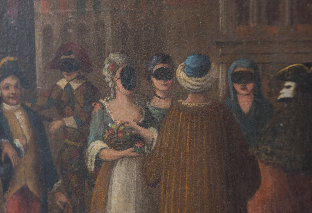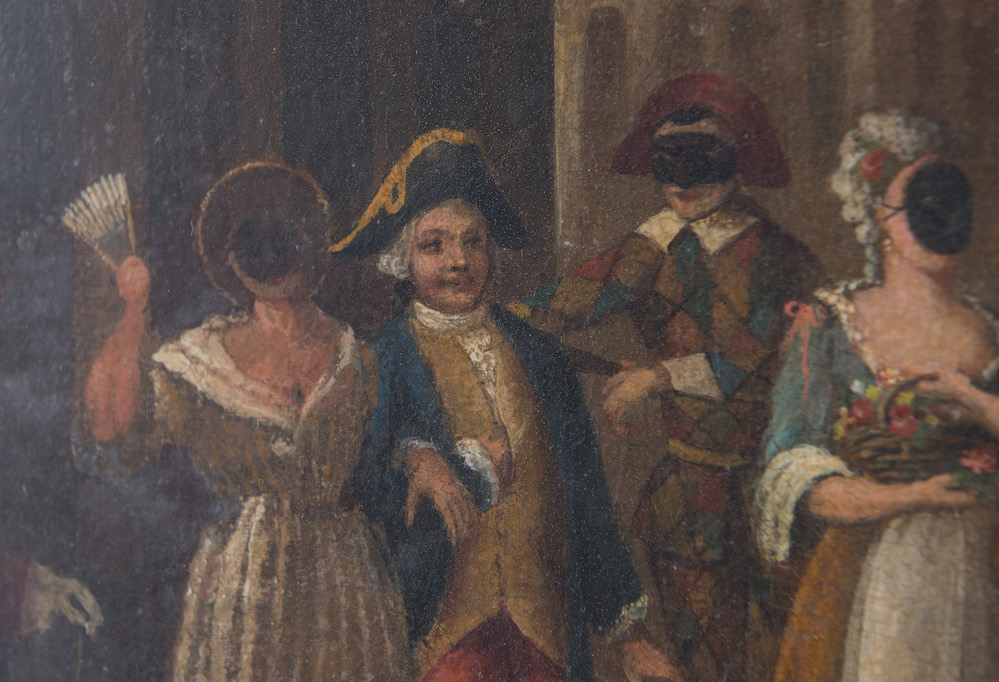Maestro veneto del XVIII secolo “Scena carnevalesca”. Olio su tela. Cm 41x50.